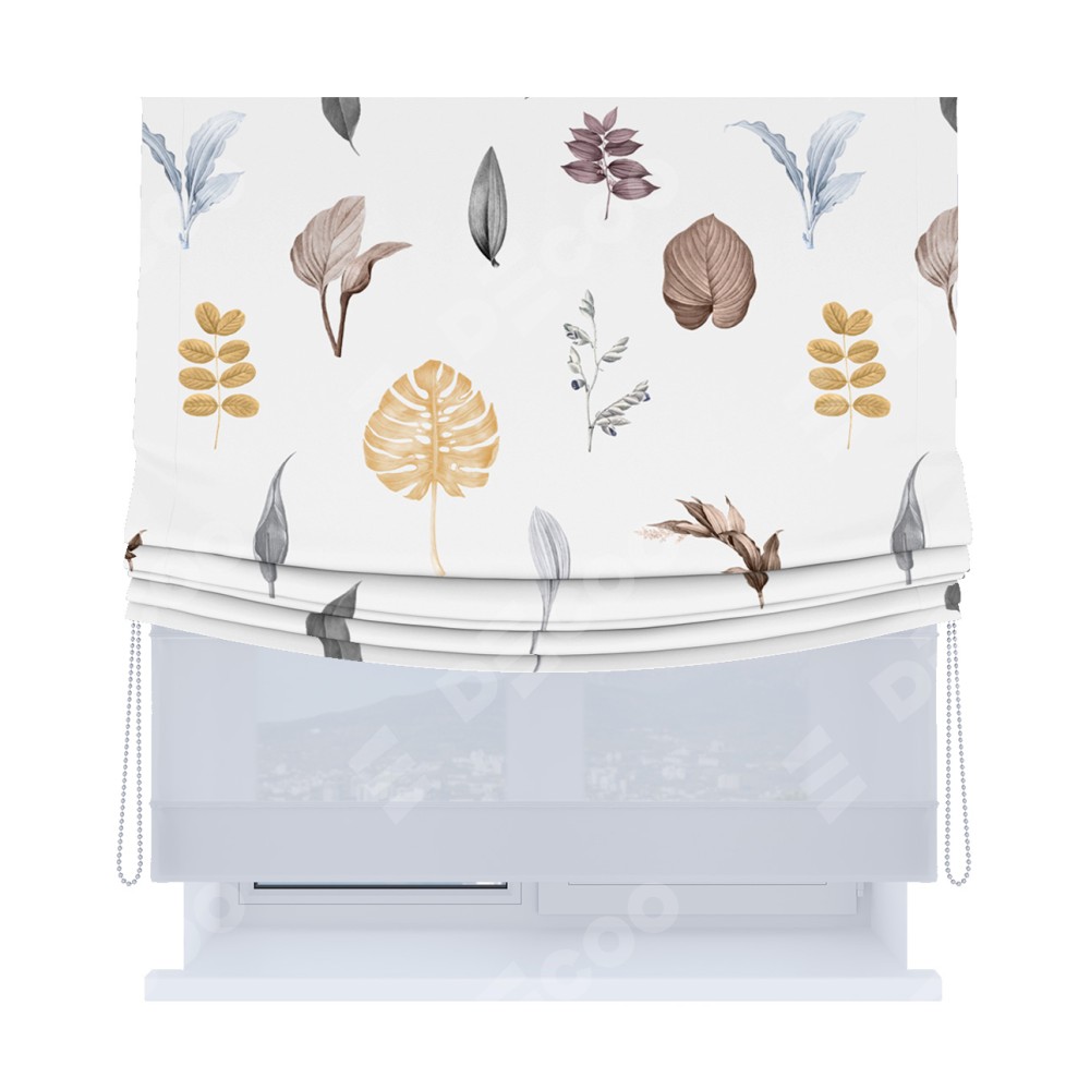 Римская штора день-ночь производителя «Cortin», используется для проёма, пошита из двух полотен, с лицевой блэкаут с нанесением сублимационной печати «Осенний коллаж», вторая ткань тюль (по стандарту комплектуется тюль белого цвета артикул V-01). Имеет универсальный механизм и подходит для монтажа: на потолок, на стену и в нишу. Удобное управление каждой шторой отдельно.