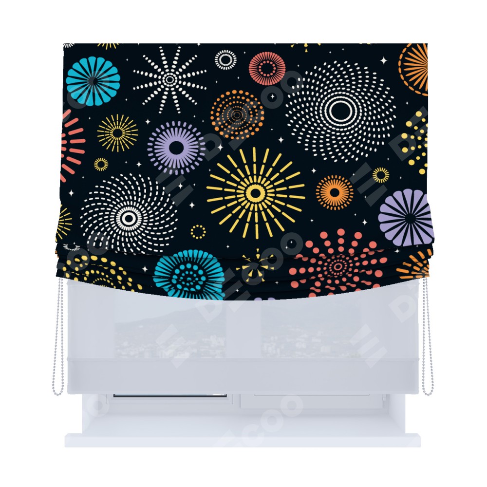 Римская штора день-ночь производителя «Cortin», используется для проёма, пошита из двух полотен, с лицевой блэкаут с нанесением сублимационной печати «Праздничный фейерверк», вторая ткань тюль (по стандарту комплектуется тюль белого цвета артикул V-01). Имеет универсальный механизм и подходит для монтажа: на потолок, на стену и в нишу. Удобное управление каждой шторой отдельно.
