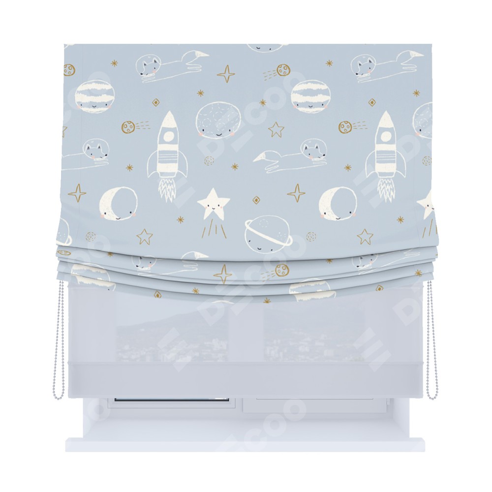 Римская штора день-ночь производителя «Cortin», используется для проёма, пошита из двух полотен, с лицевой блэкаут с нанесением сублимационной печати «Прекрасная вселенная», вторая ткань тюль (по стандарту комплектуется тюль белого цвета артикул V-01). Имеет универсальный механизм и подходит для монтажа: на потолок, на стену и в нишу. Удобное управление каждой шторой отдельно.