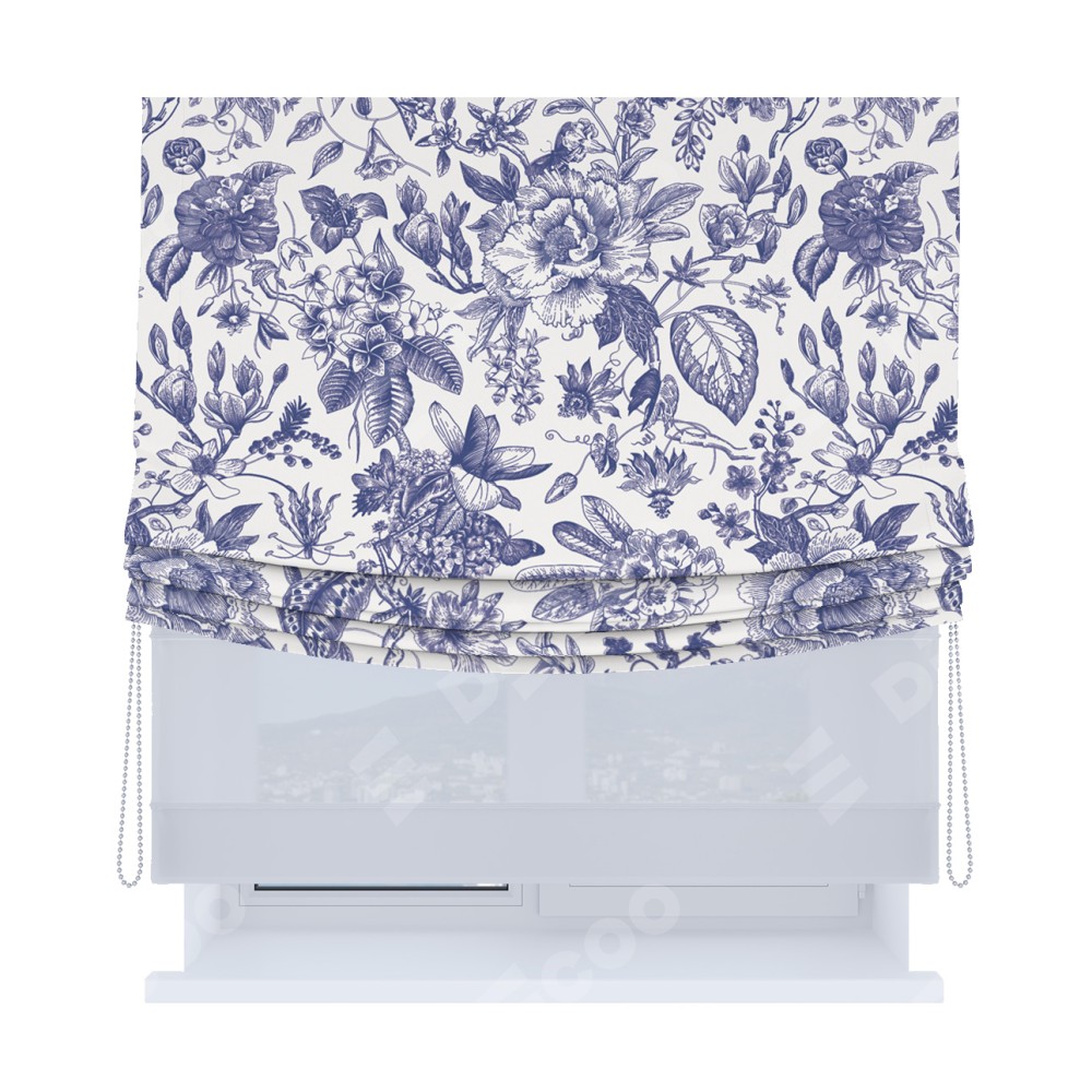 Римская штора день-ночь производителя «Cortin», используется для проёма, пошита из двух полотен, с лицевой блэкаут с нанесением сублимационной печати «Прованс в синем», вторая ткань тюль (по стандарту комплектуется тюль белого цвета артикул V-01). Имеет универсальный механизм и подходит для монтажа: на потолок, на стену и в нишу. Удобное управление каждой шторой отдельно.