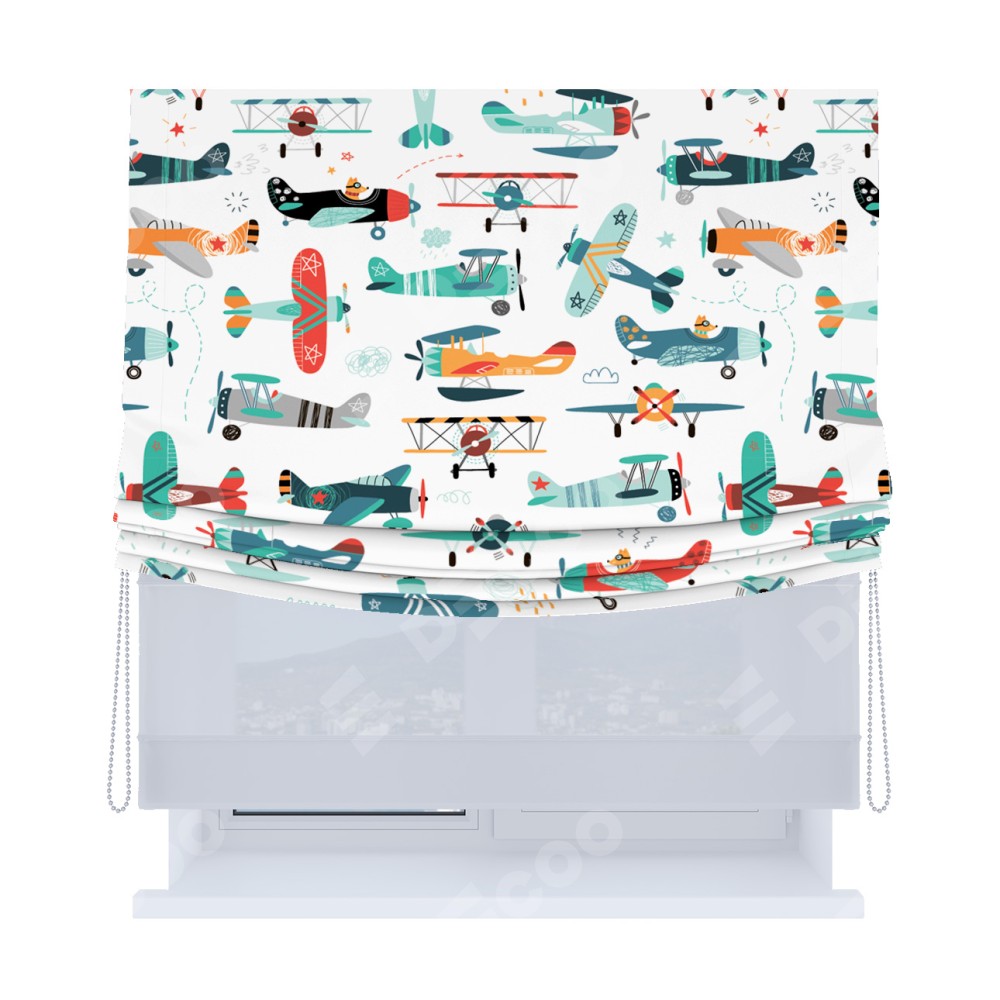 Римская штора день-ночь производителя «Cortin», используется для проёма, пошита из двух полотен, с лицевой блэкаут с нанесением сублимационной печати «Самолёты и пилоты», вторая ткань тюль (по стандарту комплектуется тюль белого цвета артикул V-01). Имеет универсальный механизм и подходит для монтажа: на потолок, на стену и в нишу. Удобное управление каждой шторой отдельно.