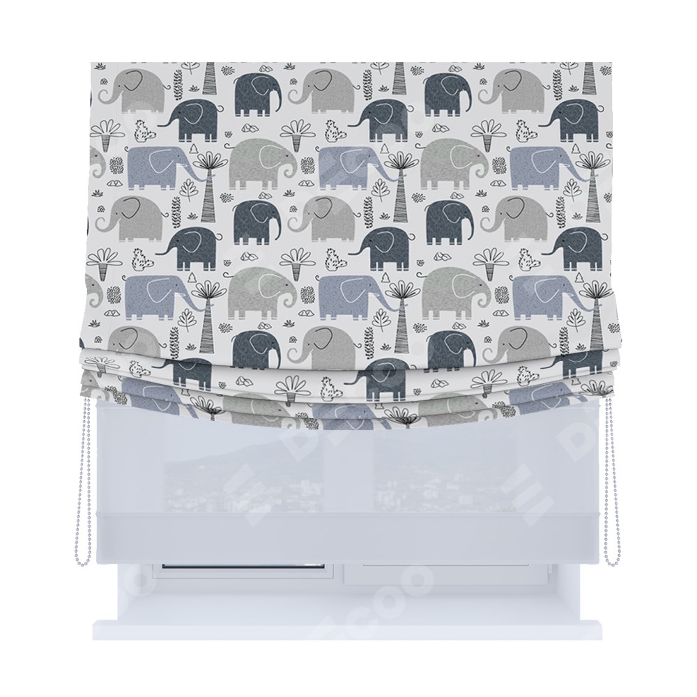 Римская штора день-ночь производителя «Cortin», используется для проёма, пошита из двух полотен, с лицевой блэкаут с нанесением сублимационной печати «Серые слоники», вторая ткань тюль (по стандарту комплектуется тюль белого цвета артикул V-01). Имеет универсальный механизм и подходит для монтажа: на потолок, на стену и в нишу. Удобное управление каждой шторой отдельно.