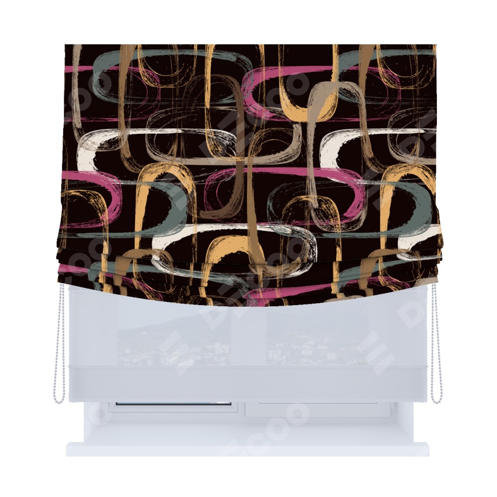 Римская штора день-ночь производителя «Cortin», используется для проёма, пошита из двух полотен, с лицевой блэкаут с нанесением сублимационной печати «Тёмная палитра», вторая ткань тюль (по стандарту комплектуется тюль белого цвета артикул V-01). Имеет универсальный механизм и подходит для монтажа: на потолок, на стену и в нишу. Удобное управление каждой шторой отдельно.