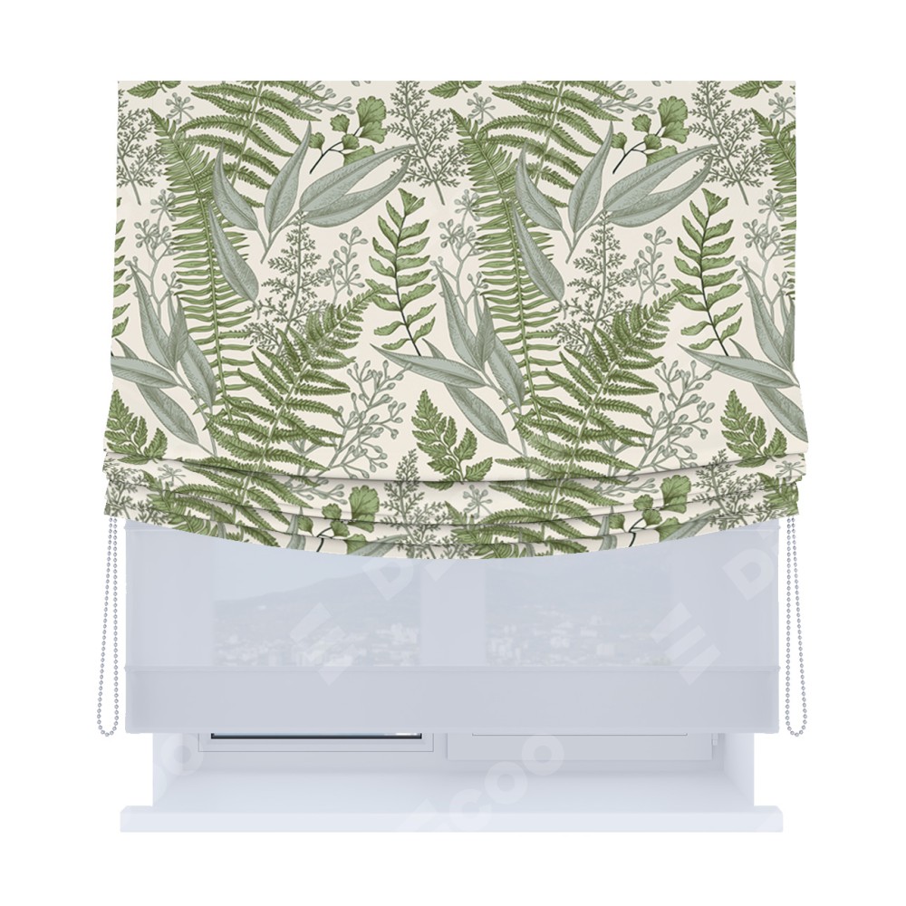 Римская штора день-ночь производителя «Cortin», используется для проёма, пошита из двух полотен, с лицевой блэкаут с нанесением сублимационной печати «Тенистый лес», вторая ткань тюль (по стандарту комплектуется тюль белого цвета артикул V-01). Имеет универсальный механизм и подходит для монтажа: на потолок, на стену и в нишу. Удобное управление каждой шторой отдельно.