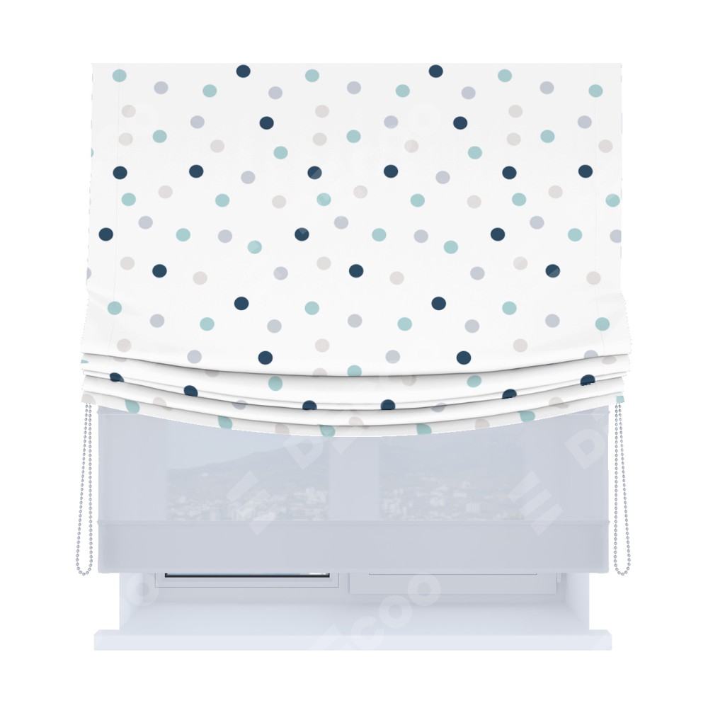 Римская штора день-ночь производителя «Cortin», используется для проёма, пошита из двух полотен, с лицевой блэкаут с нанесением сублимационной печати «Точки», вторая ткань тюль (по стандарту комплектуется тюль белого цвета артикул V-01). Имеет универсальный механизм и подходит для монтажа: на потолок, на стену и в нишу. Удобное управление каждой шторой отдельно.