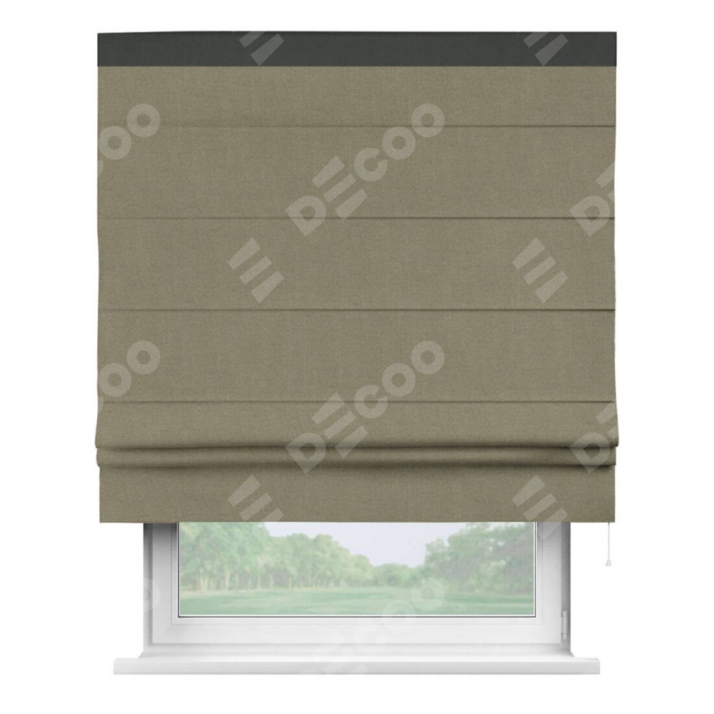 Римская штора производителя «Cortin», используется для проёма, пошита из ткани лён блэкаут бежевый, артикул 69435. Отделка шторы кантом «Кинг», ткань для канта используется из льна разной расцветки на выбор. Имеет универсальный механизм и подходит для монтажа: на потолок, на стену и в нишу.
