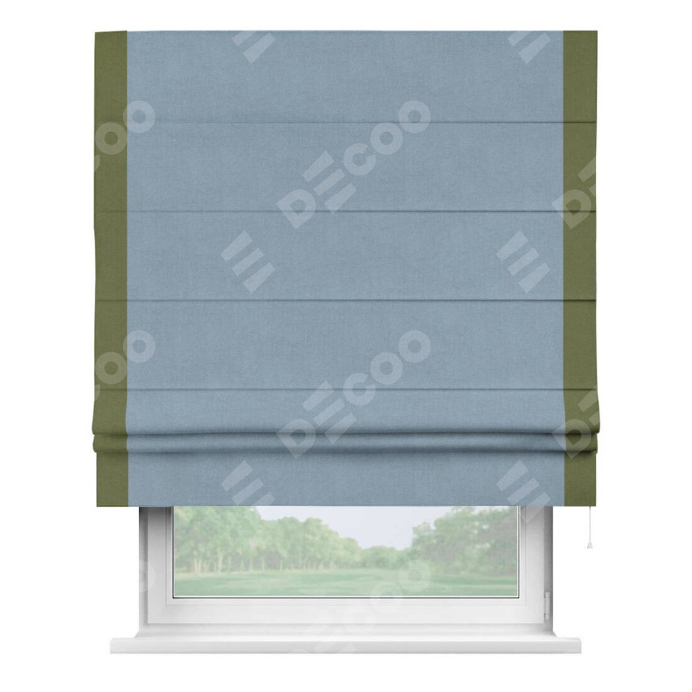 Римская штора производителя «Cortin», используется для проёма, пошита из ткани лён блэкаут голубой, артикул 69574. Отделка шторы кантом «Стрим Дуо», ткань для канта используется из льна разной расцветки на выбор. Имеет универсальный механизм и подходит для монтажа: на потолок, на стену и в нишу.