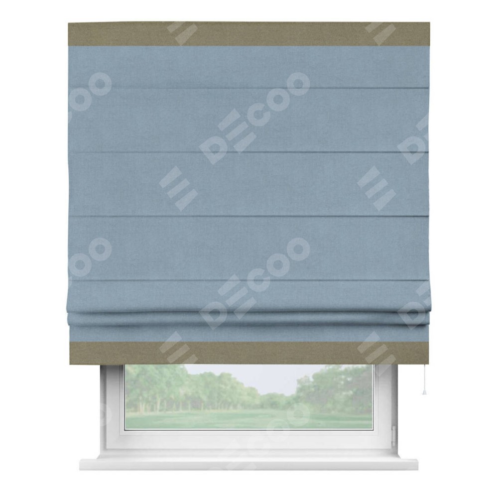 Римская штора производителя «Cortin», используется для проёма, пошита из ткани лён блэкаут голубой, артикул 69574. Отделка шторы кантом «Горизонт», ткань для канта используется из льна разной расцветки на выбор. Имеет универсальный механизм и подходит для монтажа: на потолок, на стену и в нишу.