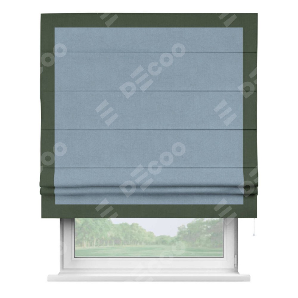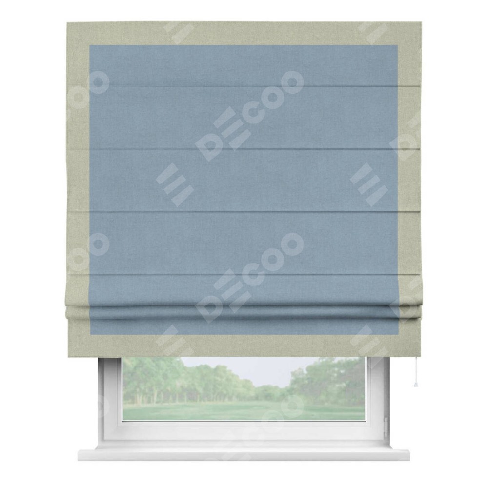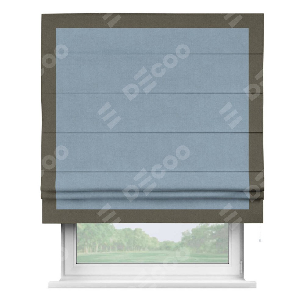 Римская штора производителя «Cortin», используется для проёма, пошита из ткани лён блэкаут голубой, артикул 69574. Отделка шторы кантом «Чесс», ткань для канта используется из льна разной расцветки на выбор. Имеет универсальный механизм и подходит для монтажа: на потолок, на стену и в нишу.
