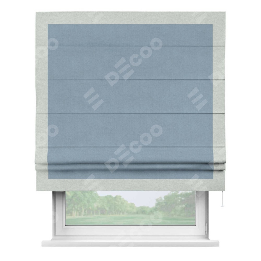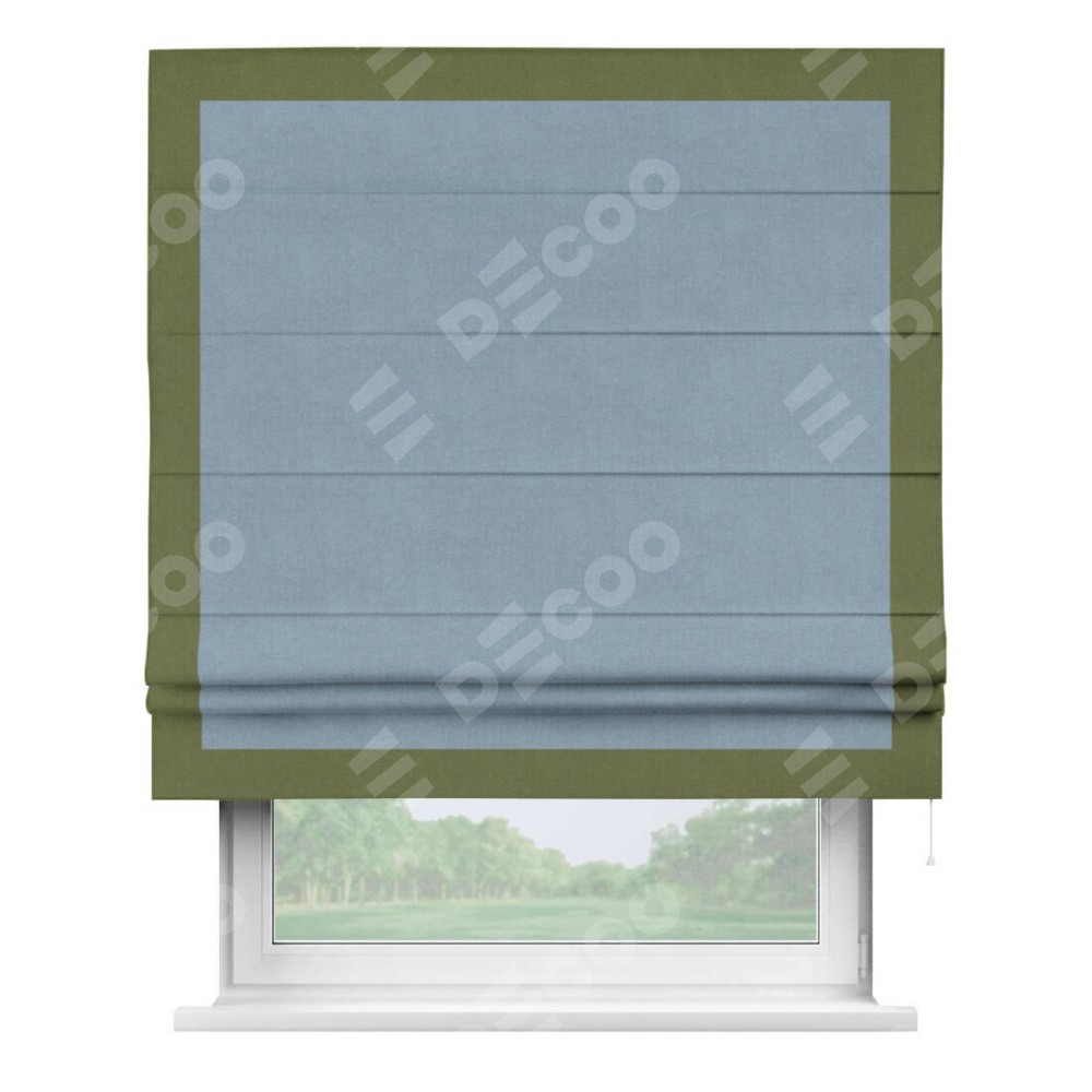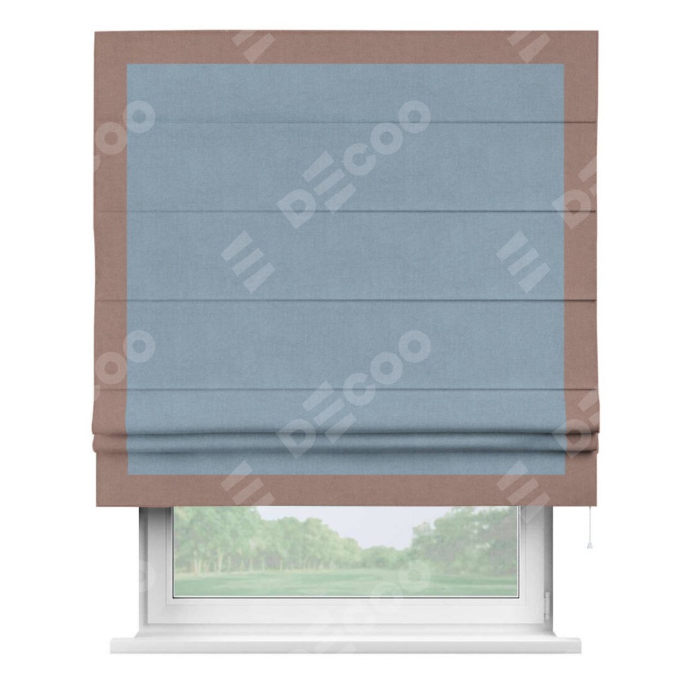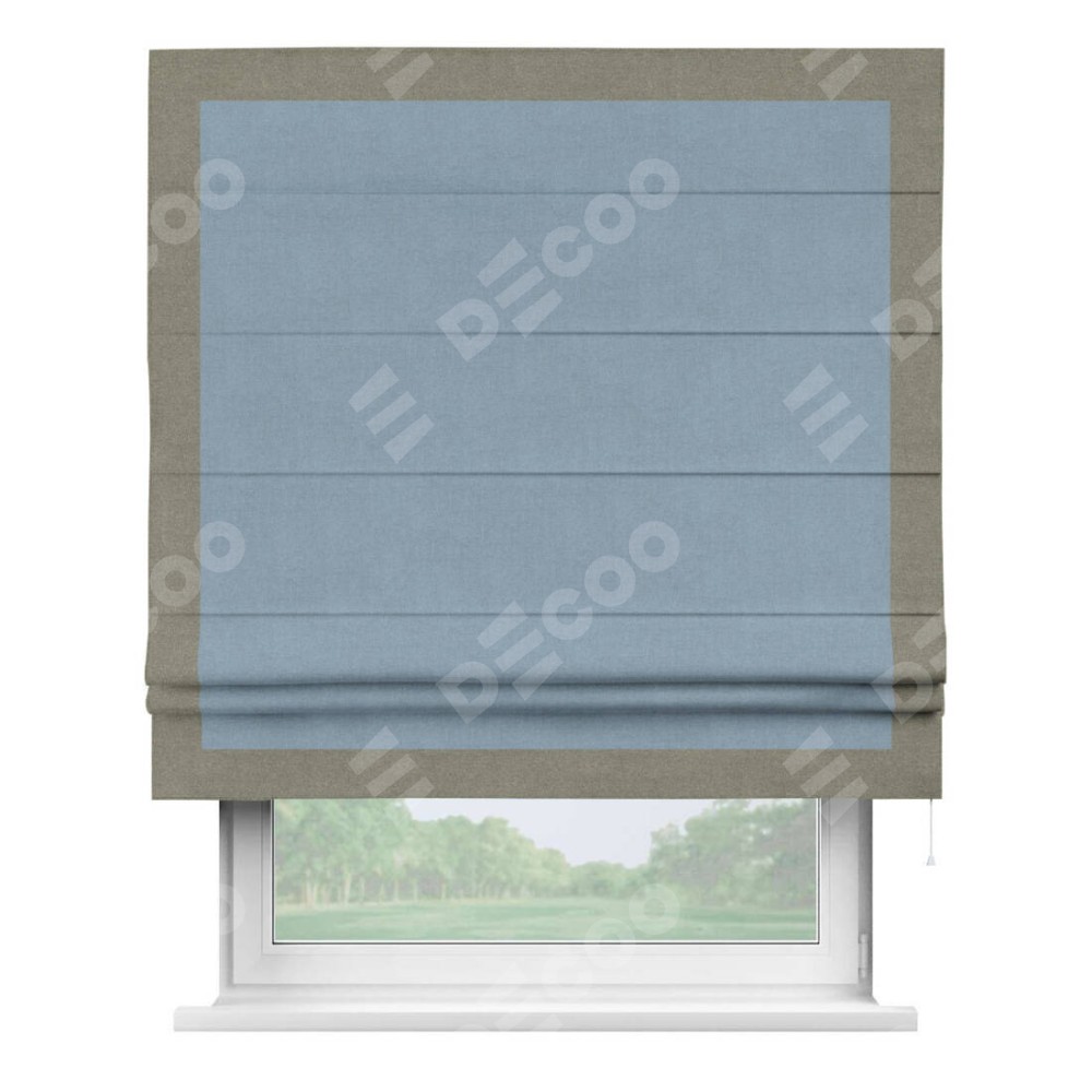 Римская штора производителя «Cortin», используется для проёма, пошита из ткани лён блэкаут голубой, артикул 69574. Отделка шторы кантом «Чесс», ткань для канта используется из льна разной расцветки на выбор. Имеет универсальный механизм и подходит для монтажа: на потолок, на стену и в нишу.