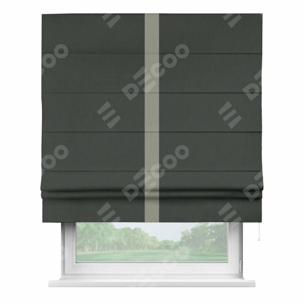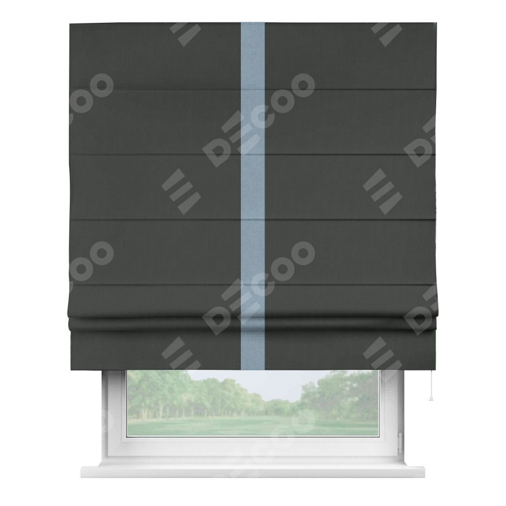 Римская штора производителя «Cortin», используется для проёма, пошита из ткани лён блэкаут графит, артикул 69448. Отделка шторы кантом «Хайвэй», ткань для канта используется из льна разной расцветки на выбор. Имеет универсальный механизм и подходит для монтажа: на потолок, на стену и в нишу.