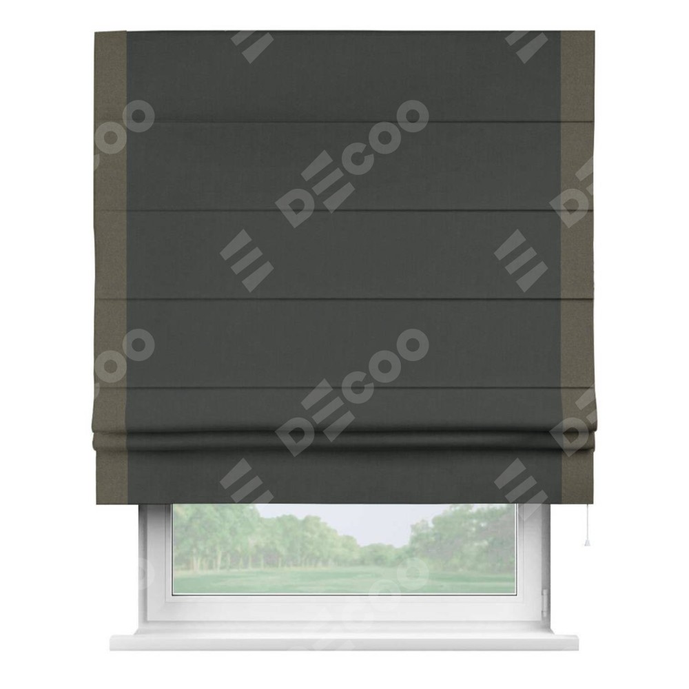 Римская штора производителя «Cortin», используется для проёма, пошита из ткани лён блэкаут графит, артикул 69448. Отделка шторы кантом «Стрим Дуо», ткань для канта используется из льна разной расцветки на выбор. Имеет универсальный механизм и подходит для монтажа: на потолок, на стену и в нишу.