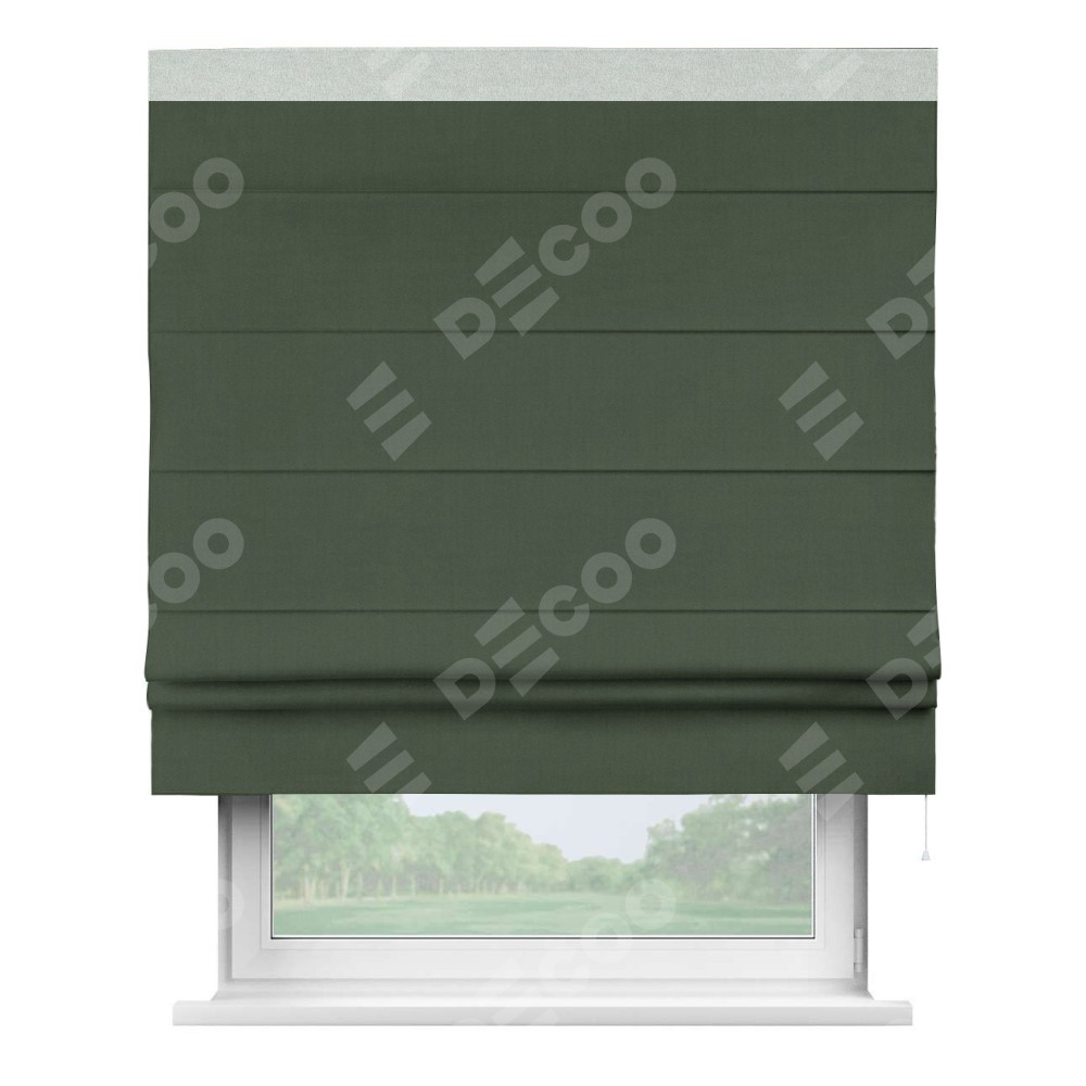 Римская штора производителя «Cortin», используется для проёма, пошита из ткани лён блэкаут зелёный, артикул 69497. Отделка шторы кантом «Кинг», ткань для канта используется из льна разной расцветки на выбор. Имеет универсальный механизм и подходит для монтажа: на потолок, на стену и в нишу.