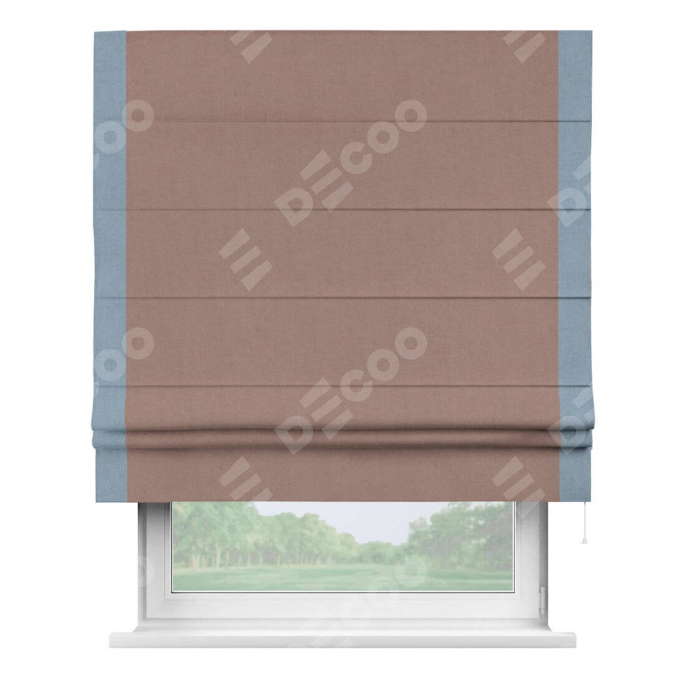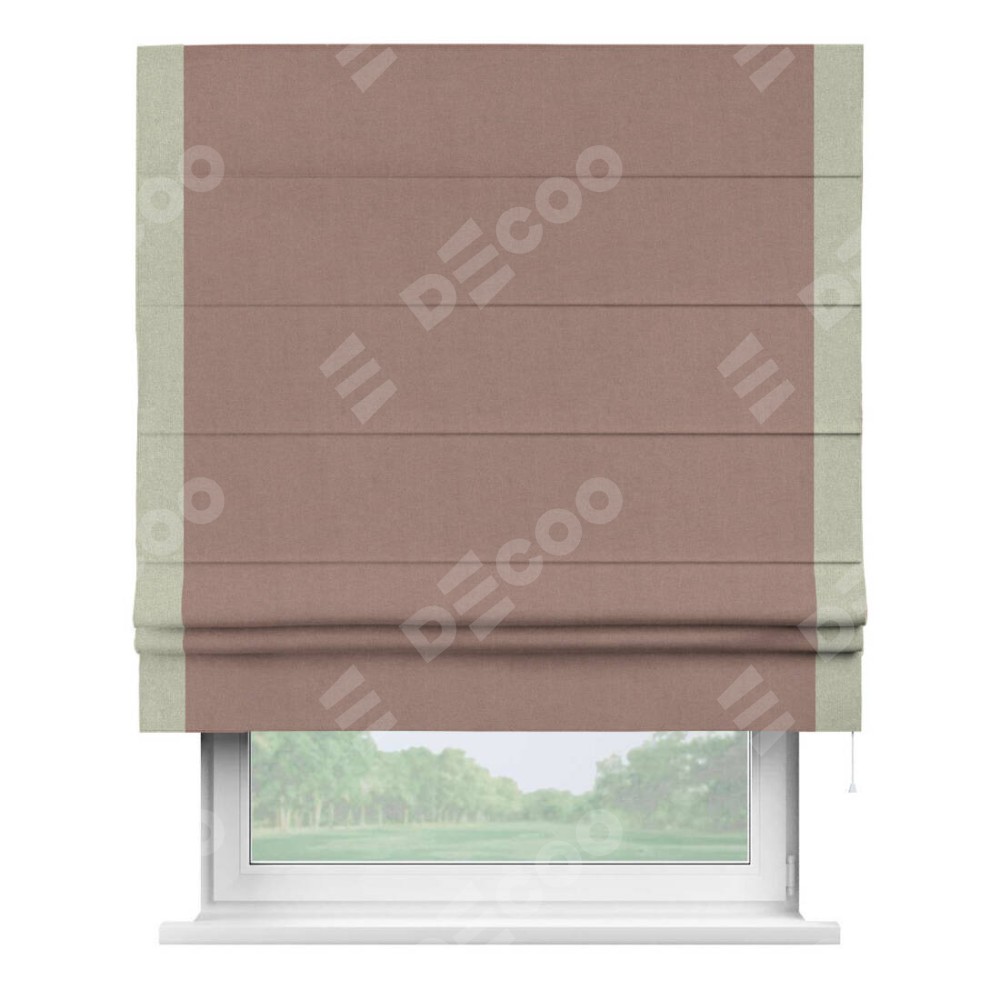 Римская штора производителя «Cortin», используется для проёма, пошита из ткани лён блэкаут розовый, артикул 69575. Отделка шторы кантом «Стрим Дуо», ткань для канта используется из льна разной расцветки на выбор. Имеет универсальный механизм и подходит для монтажа: на потолок, на стену и в нишу.