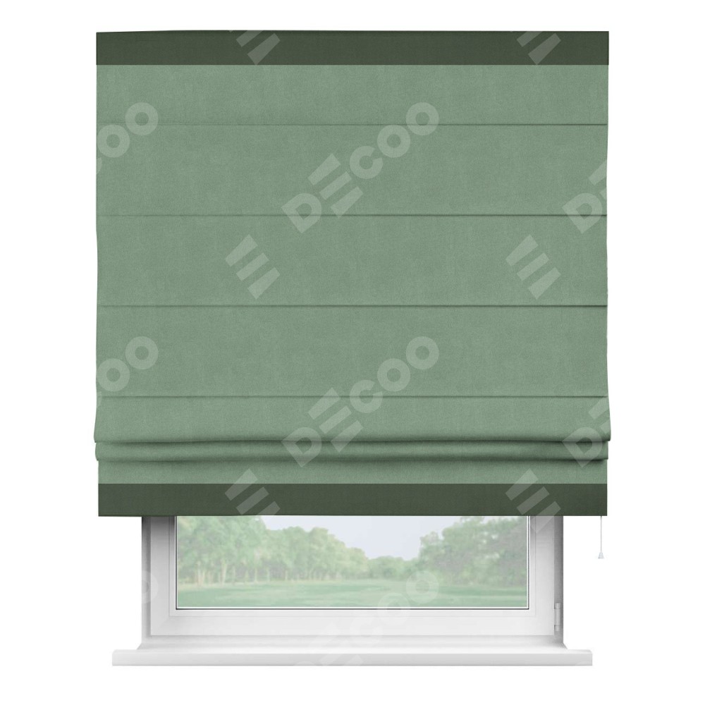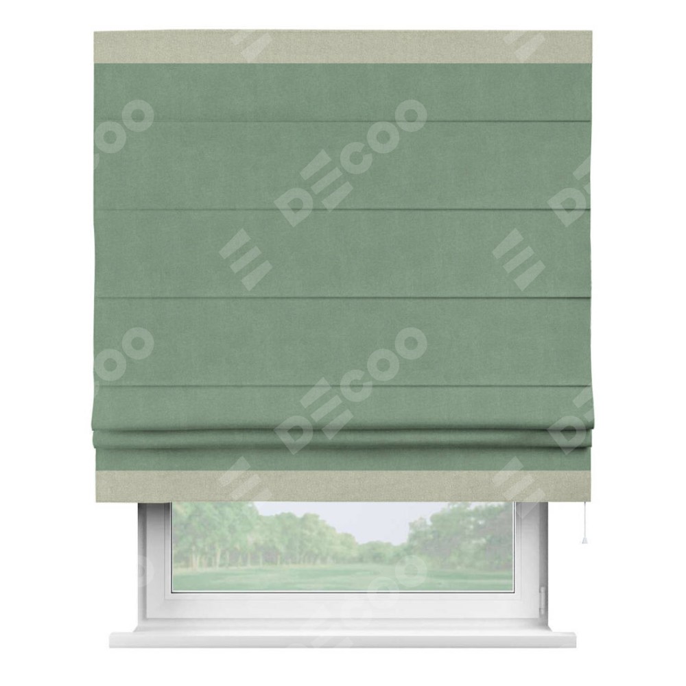 Римская штора производителя «Cortin», используется для проёма, пошита из ткани лён блэкаут светло-бирюзовый, артикул 69443. Отделка шторы кантом «Горизонт», ткань для канта используется из льна разной расцветки на выбор. Имеет универсальный механизм и подходит для монтажа: на потолок, на стену и в нишу.