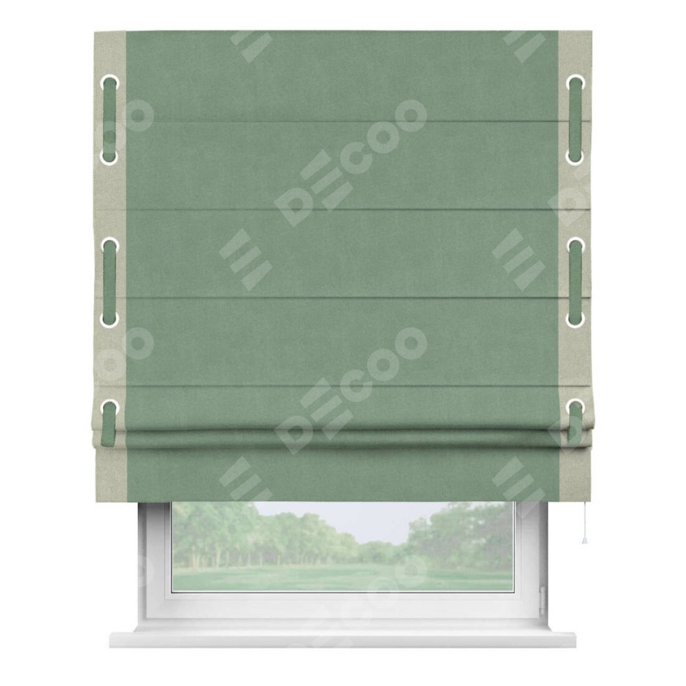 Римская штора производителя «Cortin», используется для проёма, пошита из ткани лён блэкаут светло-бирюзовый, артикул 69443. Отделка шторы кантом «Стрим Дуо» на кантах расположены люверсы с пояском, ткань для канта используется из льна разной расцветки на выбор. Ткань для пояска обычно используется из основной ткани шторы, а так же можно сделать из любой расцветки по желанию. Имеет универсальный механизм и подходит для монтажа: на потолок, на стену и в нишу.