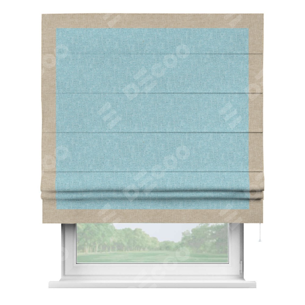 Римская штора производителя «Cortin», используется для проёма, пошита из ткани лён кашемир голубой, артикул 21616. Отделка шторы кантом «Чесс», ткань для канта используется из льна разной расцветки на выбор. Имеет универсальный механизм и подходит для монтажа: на потолок, на стену и в нишу.