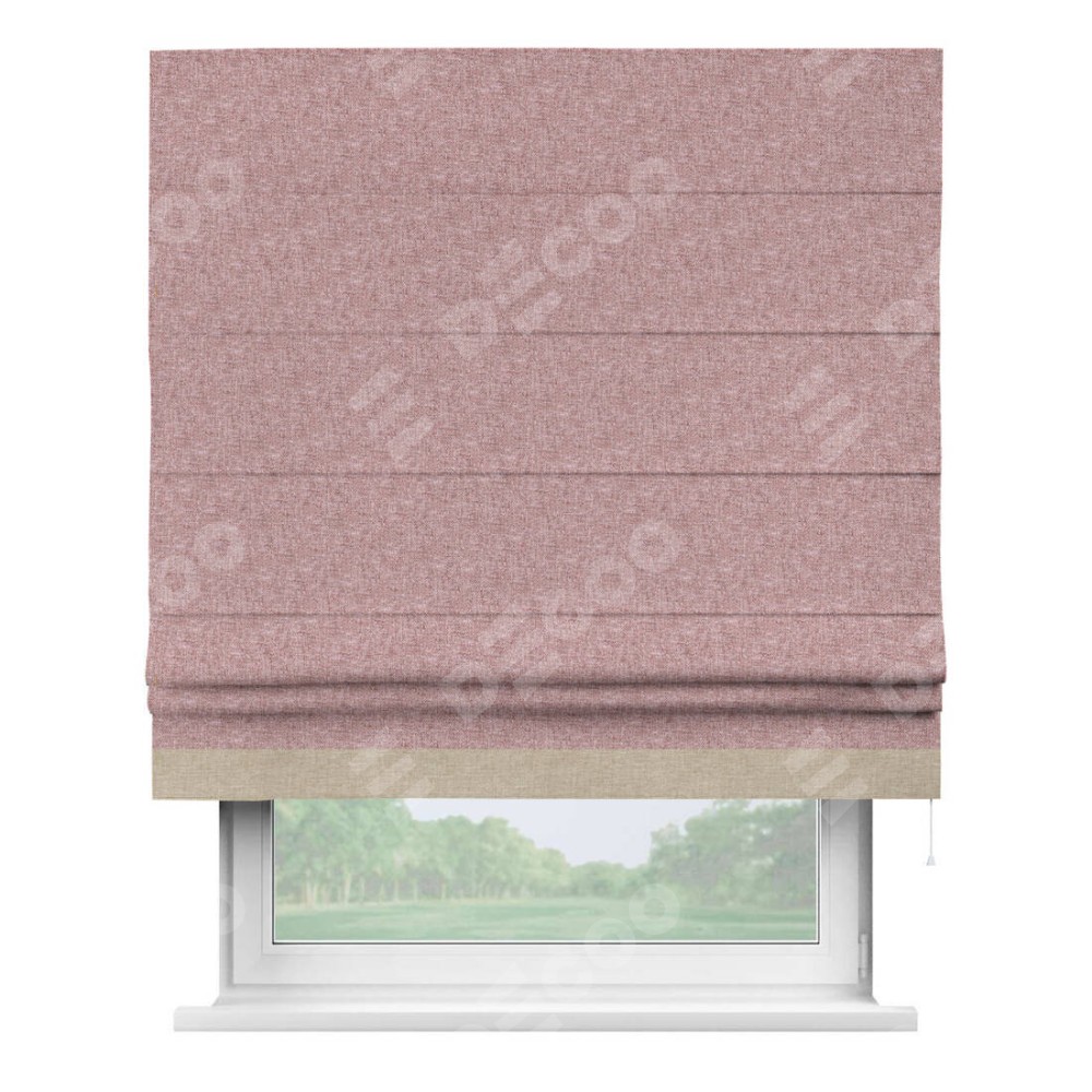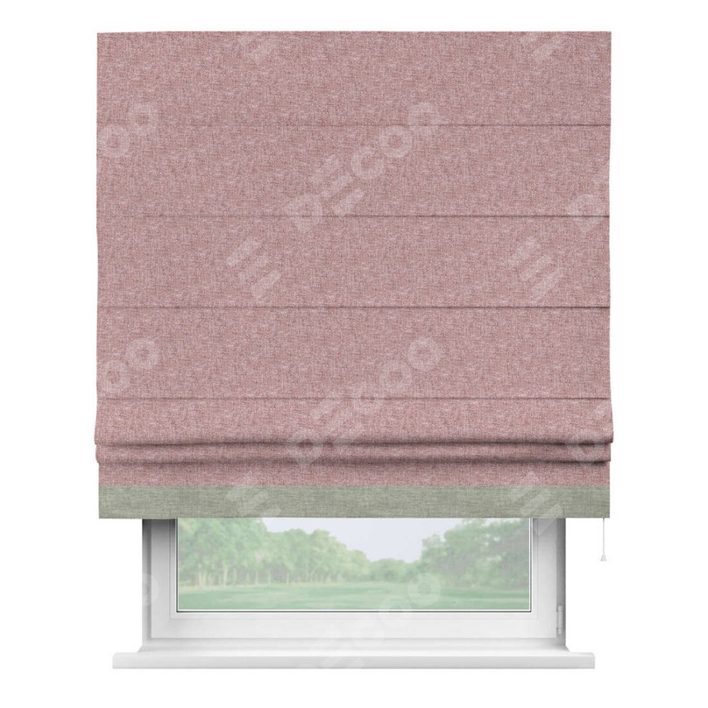 Римская штора производителя «Cortin», используется для проёма, пошита из ткани лён кашемир розовая пудра, артикул 21619. Отделка шторы кантом «Джестер», ткань для канта используется из льна разной расцветки на выбор. Имеет универсальный механизм и подходит для монтажа: на потолок, на стену и в нишу.