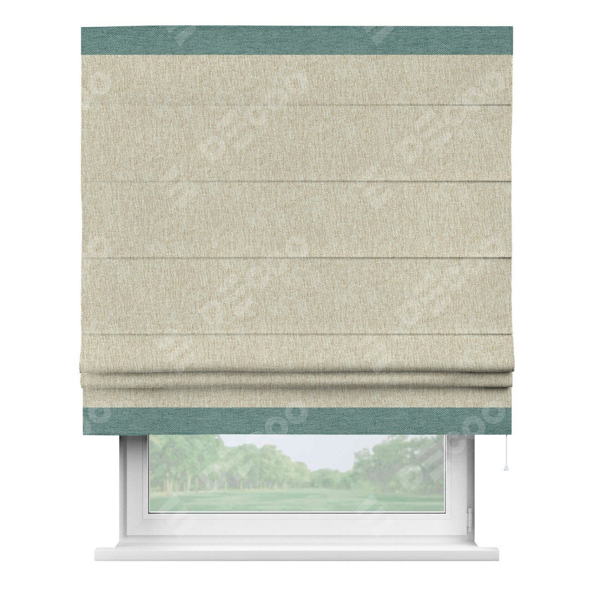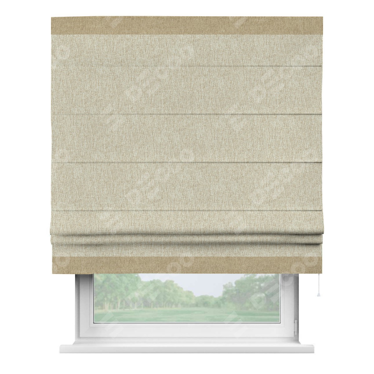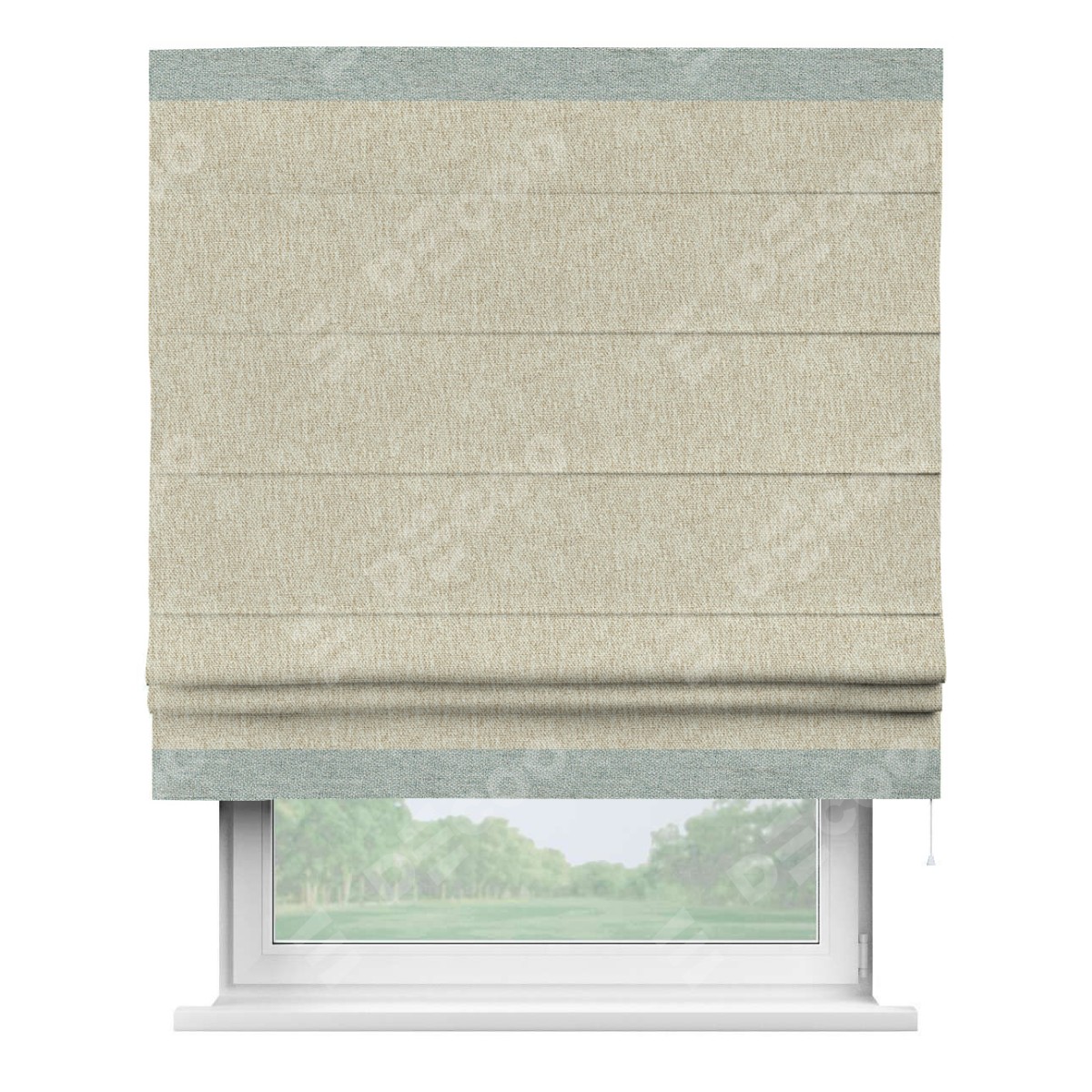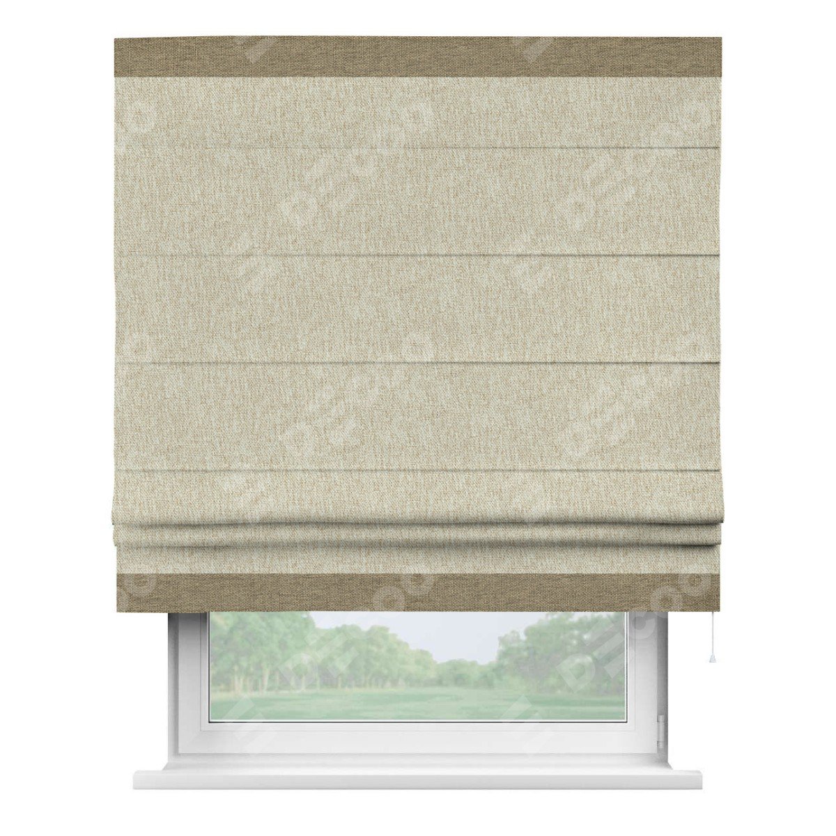 Римская штора производителя «Cortin», используется для проёма, пошита из ткани стиф димаут светло-бежевый, артикул 18084. Отделка шторы кантом «Горизонт», ткань для канта используется из стифа разной расцветки на выбор. Имеет универсальный механизм и подходит для монтажа: на потолок, на стену и в нишу.