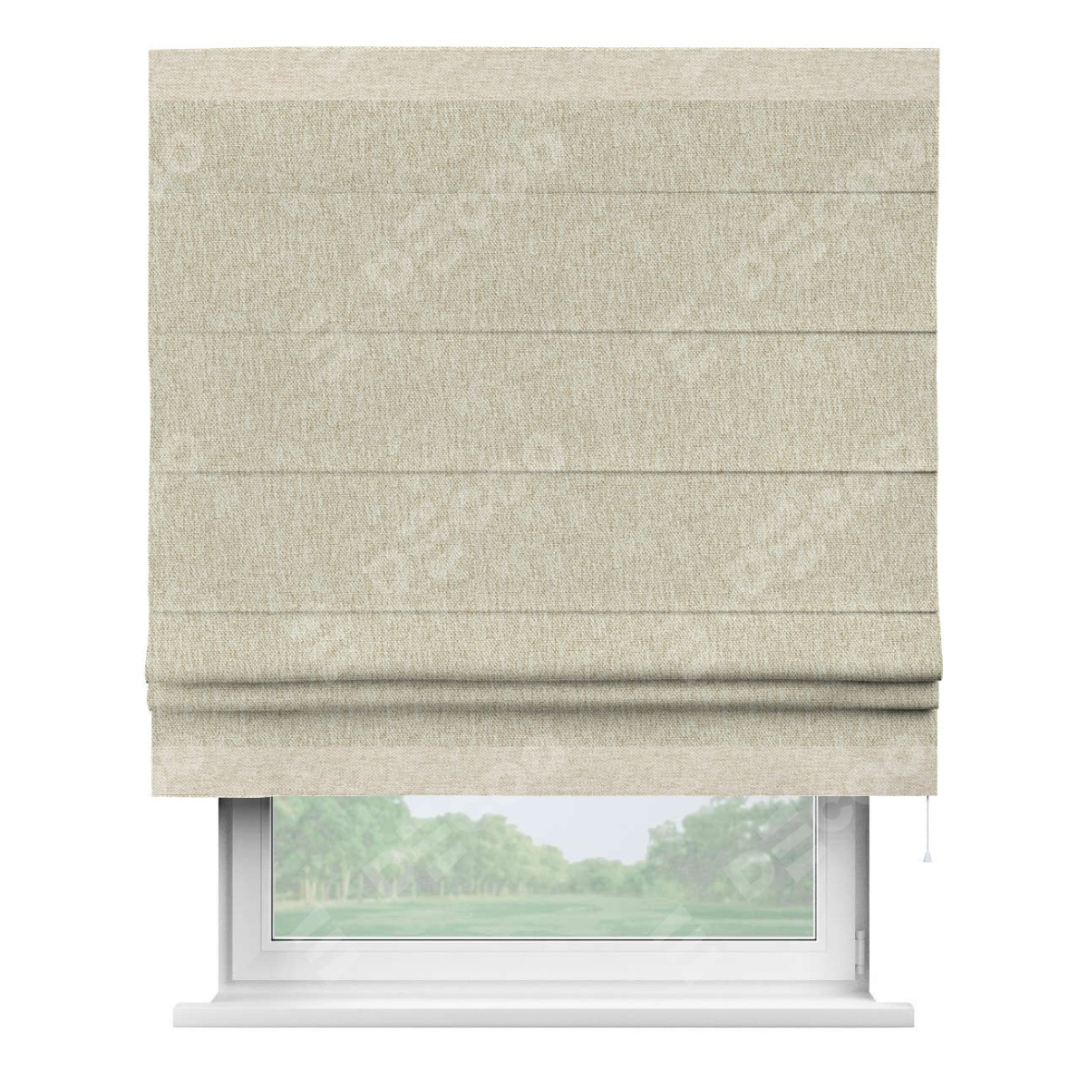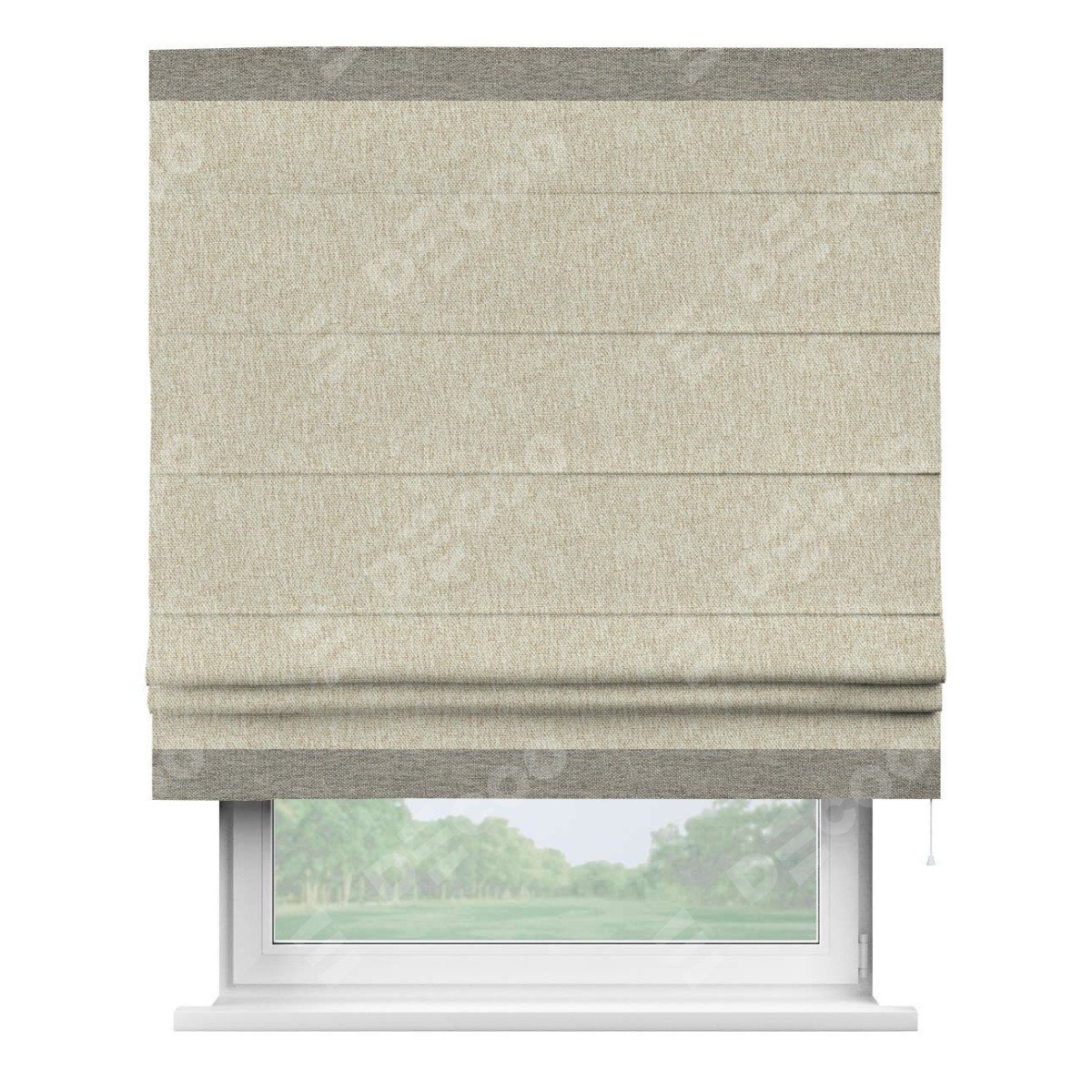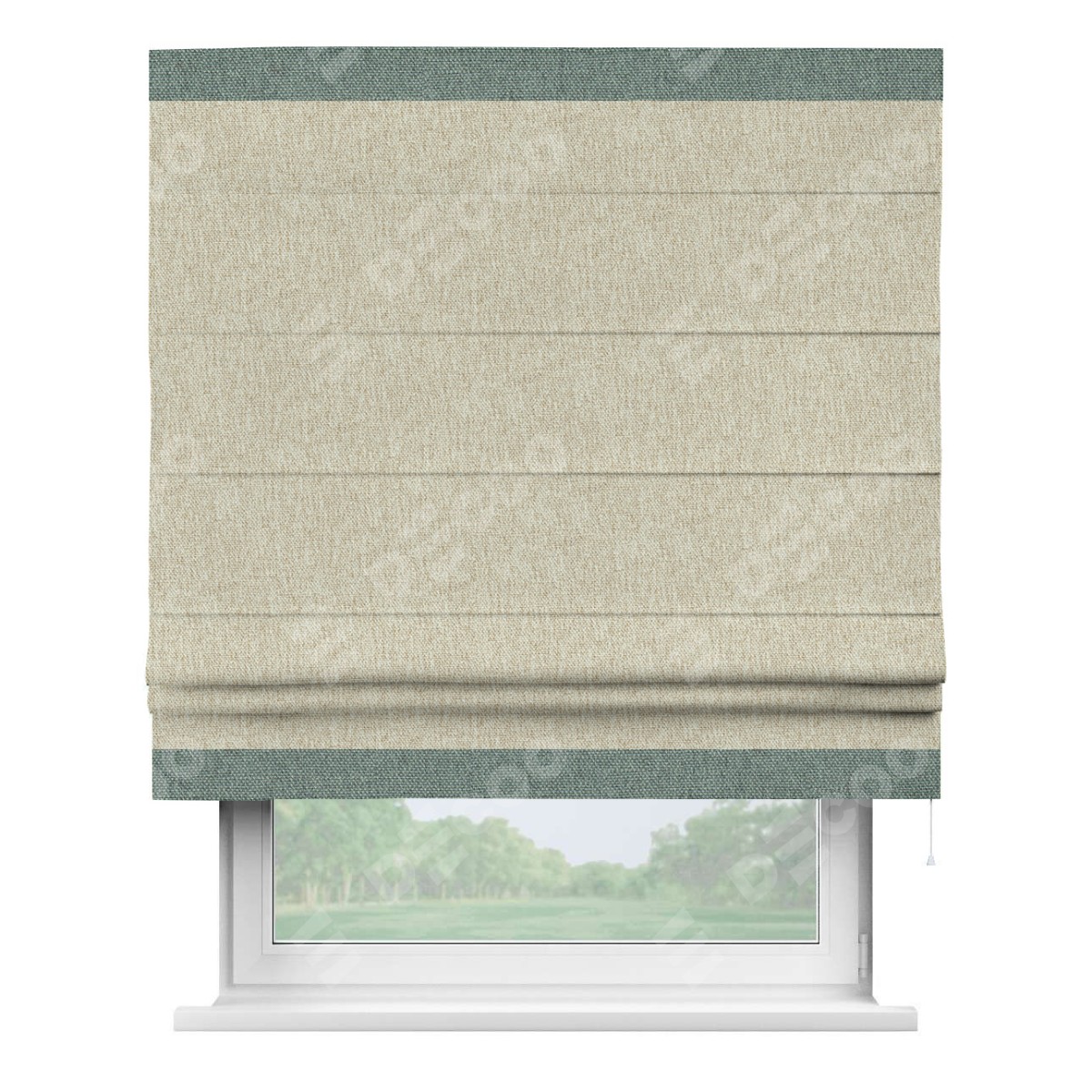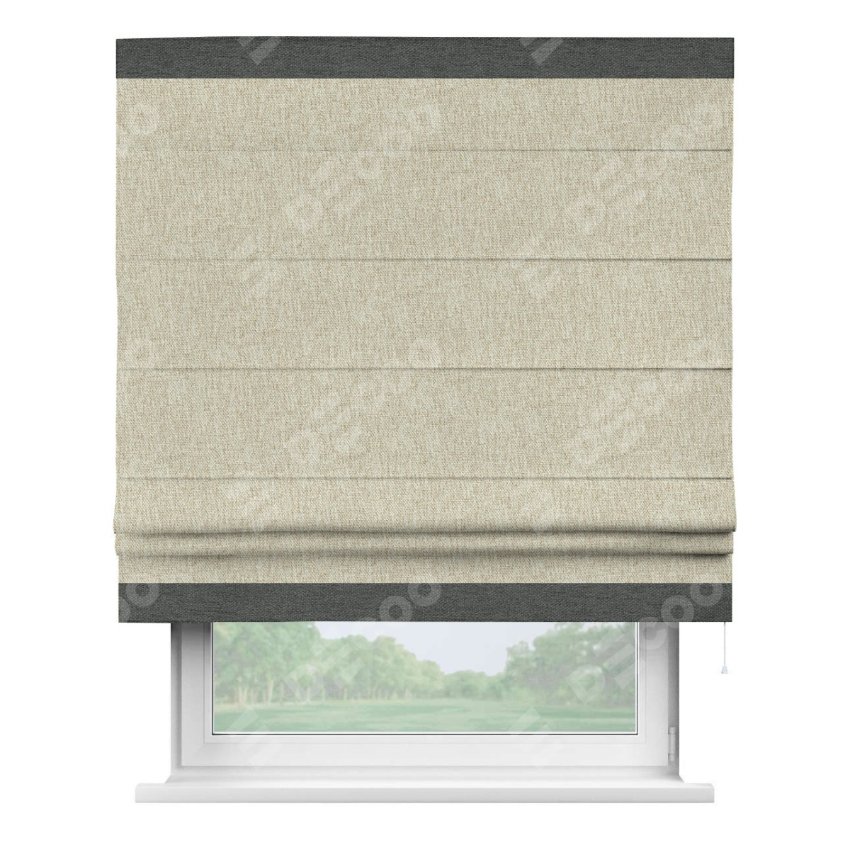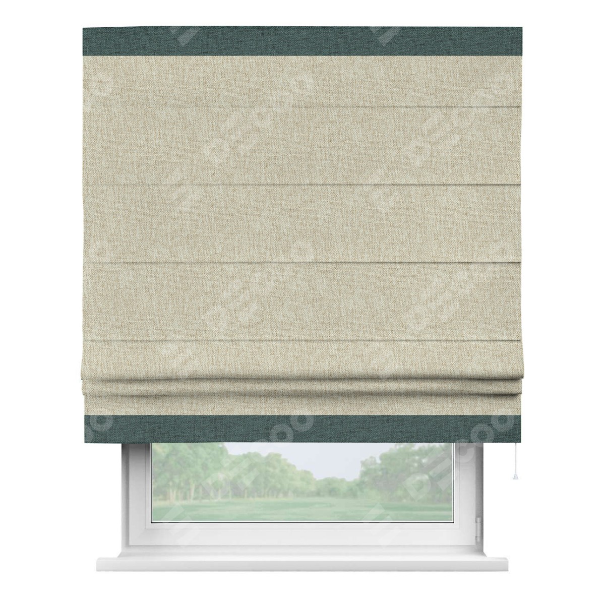 Римская штора производителя «Cortin», используется для проёма, пошита из ткани стиф димаут светло-бежевый, артикул 18084. Отделка шторы кантом «Горизонт», ткань для канта используется из стифа разной расцветки на выбор. Имеет универсальный механизм и подходит для монтажа: на потолок, на стену и в нишу.