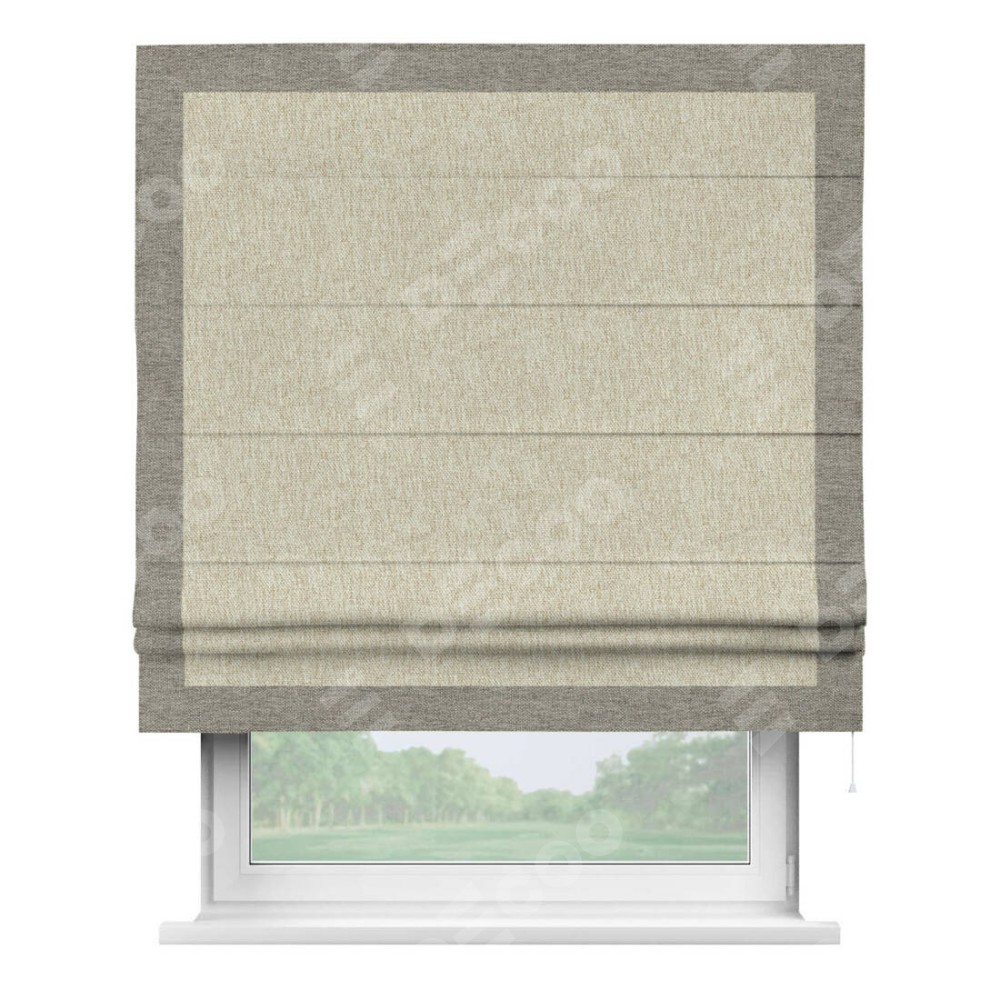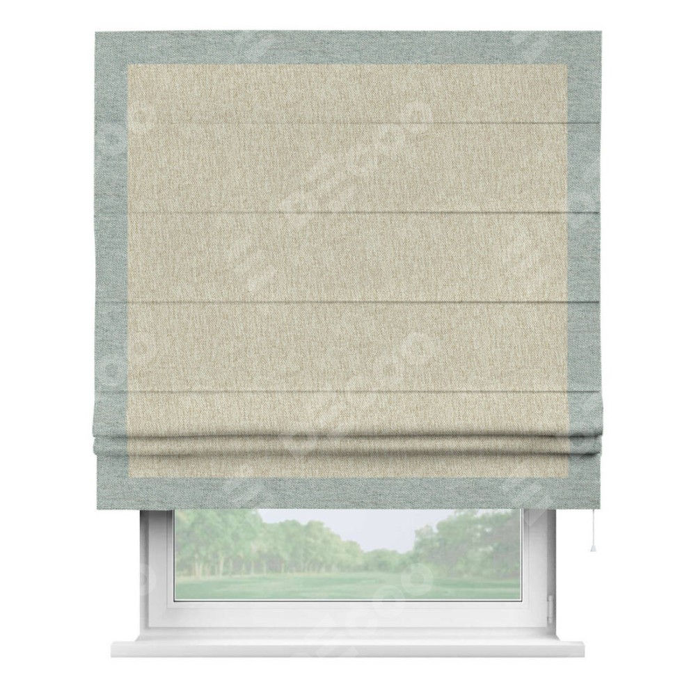 Римская штора производителя «Cortin», используется для проёма, пошита из ткани стиф димаут светло-бежевый, артикул 18084. Отделка шторы кантом «Чесс», ткань для канта используется из стифа разной расцветки на выбор. Имеет универсальный механизм и подходит для монтажа: на потолок, на стену и в нишу.