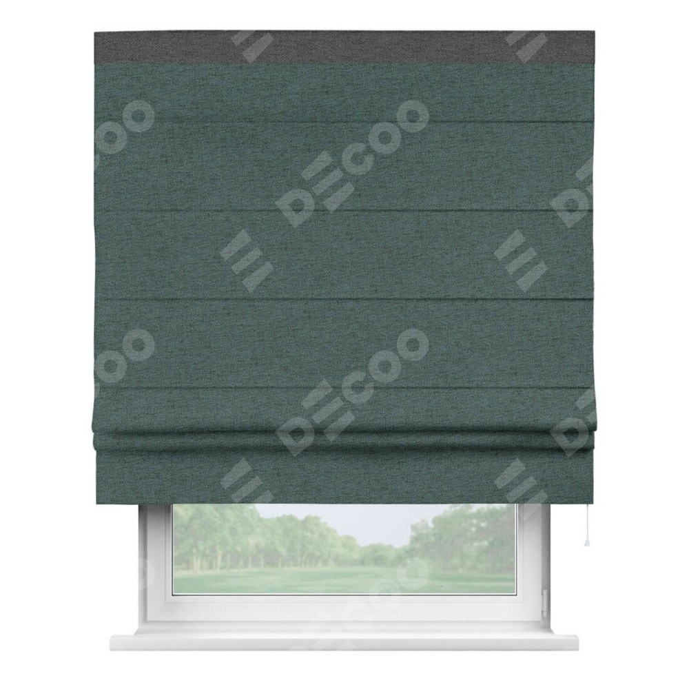 Римская штора производителя «Cortin», используется для проёма, пошита из ткани стиф димаут сине-зелёный, артикул 18194. Отделка шторы кантом «Кинг», ткань для канта используется из стифа разной расцветки на выбор. Имеет универсальный механизм и подходит для монтажа: на потолок, на стену и в нишу.