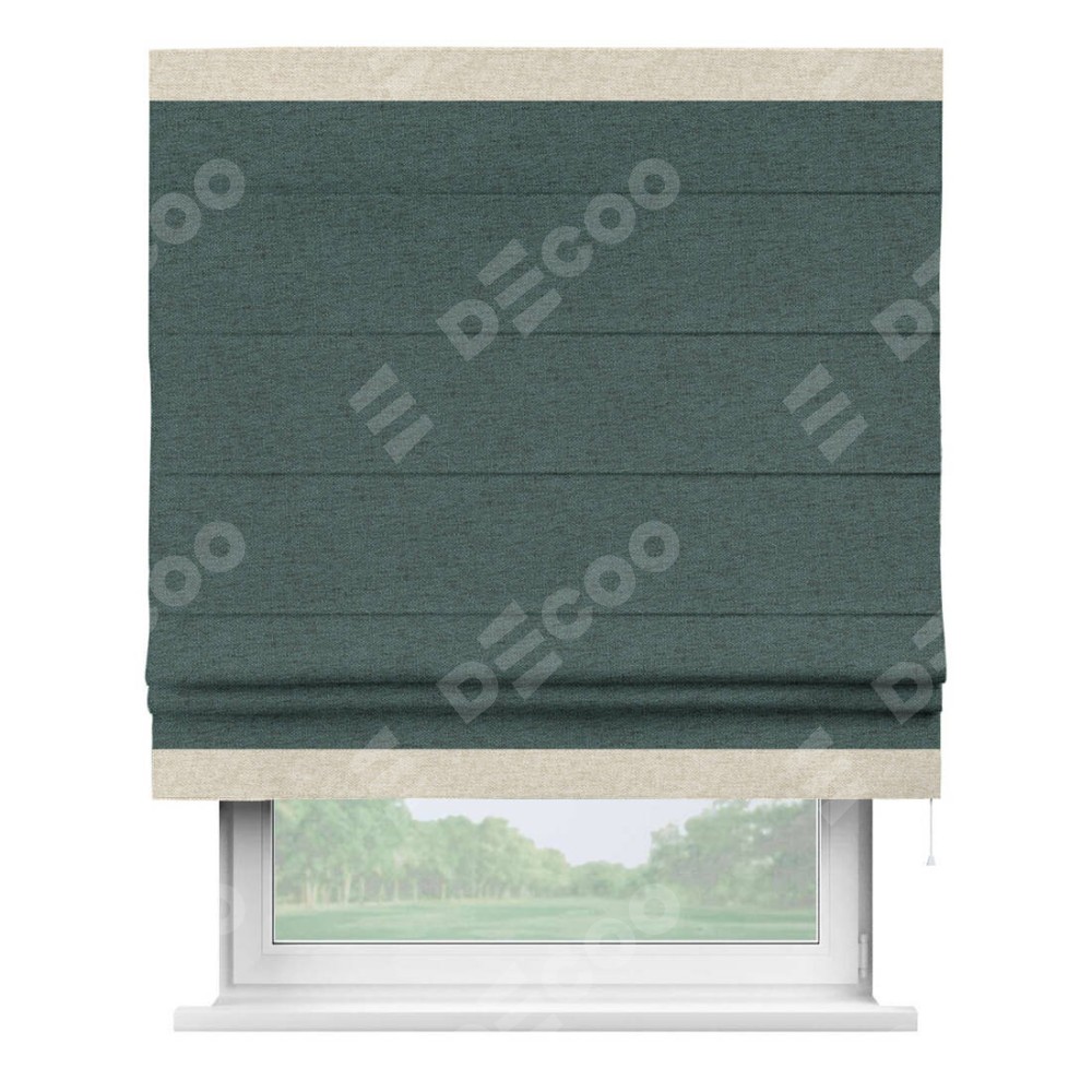 Римская штора производителя «Cortin», используется для проёма, пошита из ткани стиф димаут сине-зелёный, артикул 18194. Отделка шторы кантом «Горизонт», ткань для канта используется из стифа разной расцветки на выбор. Имеет универсальный механизм и подходит для монтажа: на потолок, на стену и в нишу.