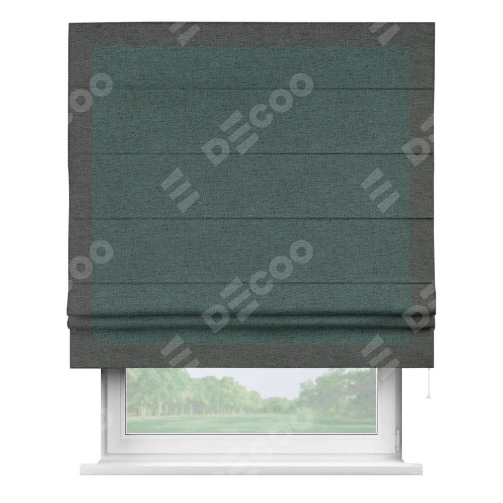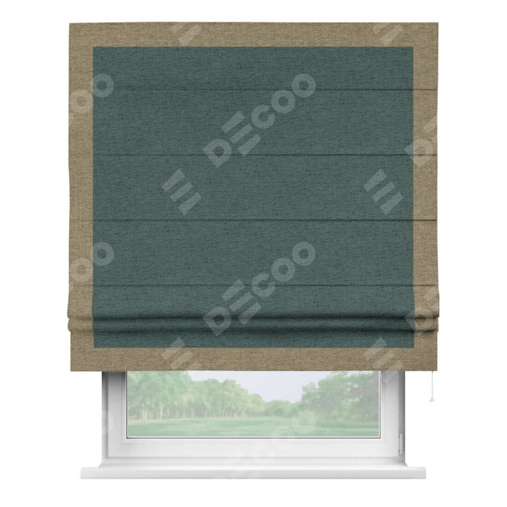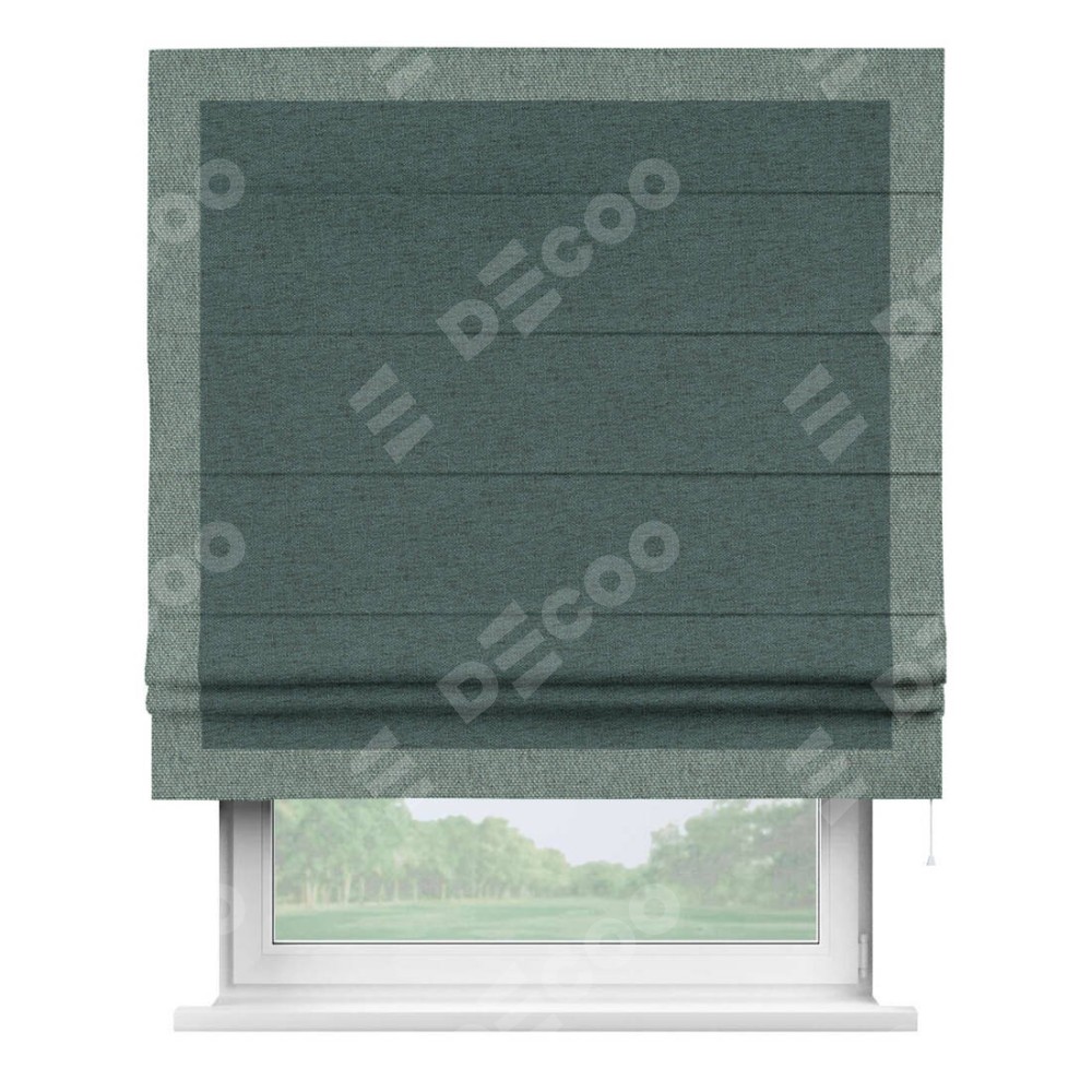 Римская штора производителя «Cortin», используется для проёма, пошита из ткани стиф димаут сине-зелёный, артикул 18194. Отделка шторы кантом «Чесс», ткань для канта используется из стифа разной расцветки на выбор. Имеет универсальный механизм и подходит для монтажа: на потолок, на стену и в нишу.