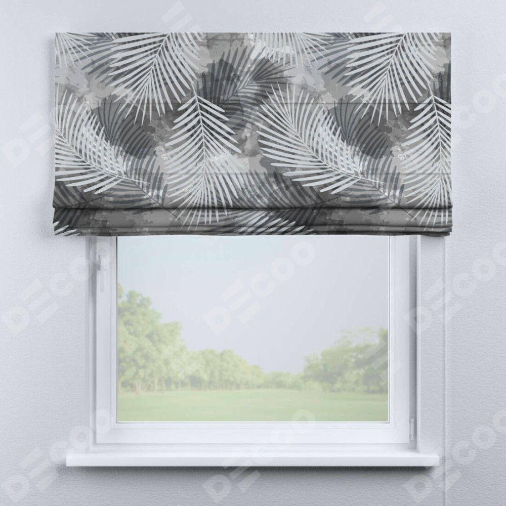 Римская штора производителя «Cortin», используется для проёма, пошита из ткани блэкаут с нанесением сублимационной печати «Листья в тени». Имеет универсальный механизм и подходит для монтажа: на потолок, на стену и в нишу.