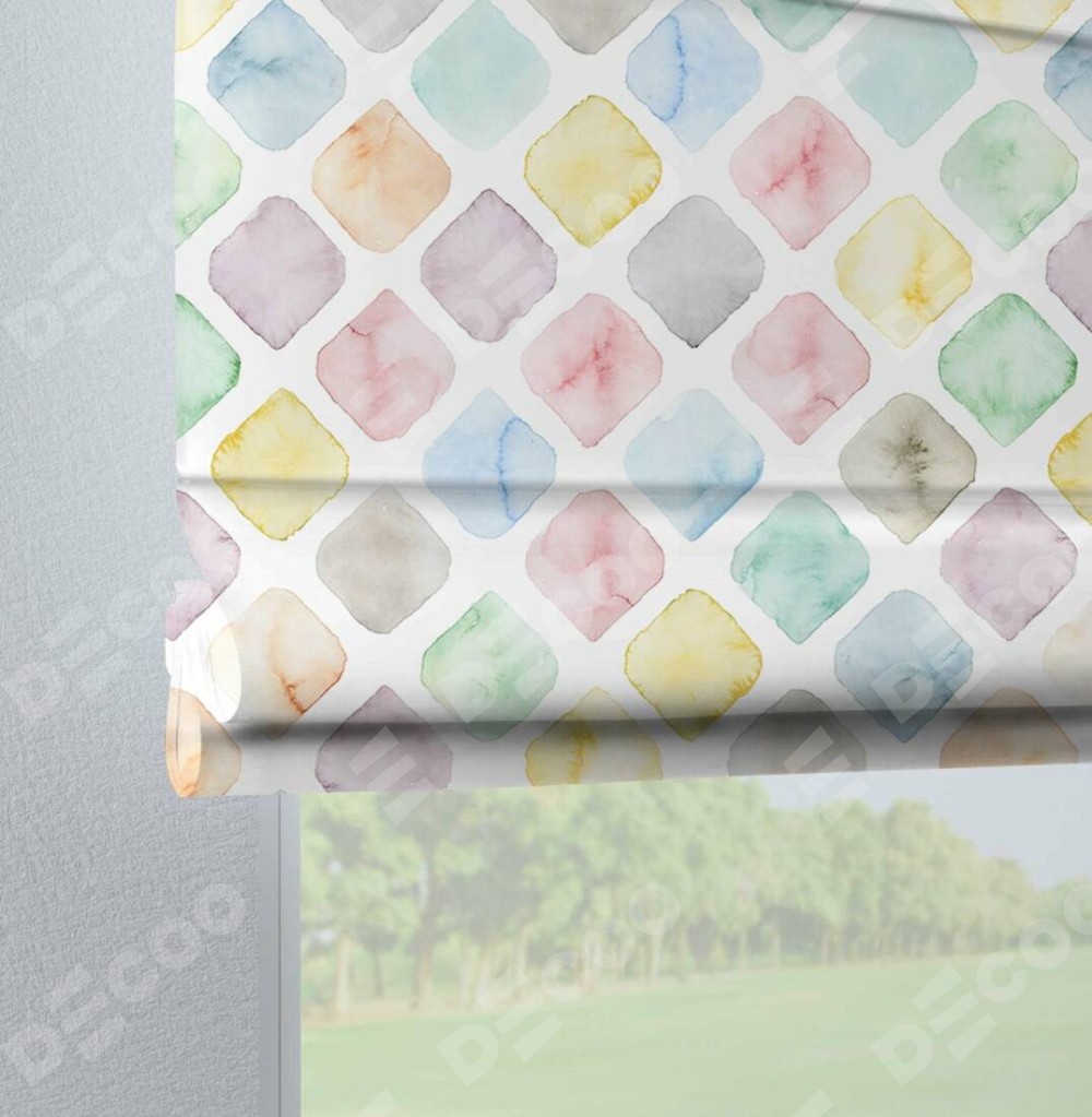 Римская штора производителя «Cortin», используется для проёма, пошита из ткани блэкаут с нанесением сублимационной печати «Мозаика акварель». Данная модель пошита на петлях, комплектуется на выбор круглым карнизом и подходит для монтажа на стену. Римская штора на петлях имеет простую систему регулировки высоты, отличительным преимуществом данной модели является простой способ монтажа. Достаточно повесить ее на трубу и штора готова!