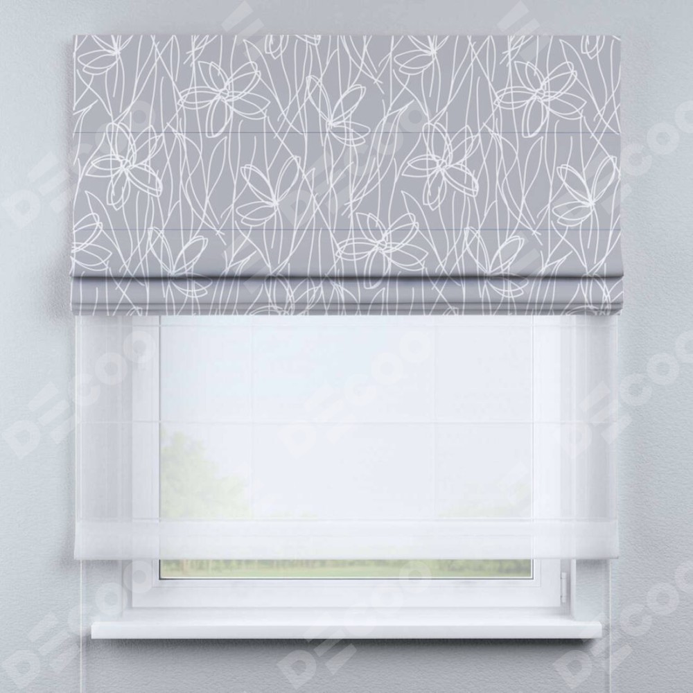 Римская штора день-ночь производителя «Cortin», используется для проёма, пошита из двух полотен, с лицевой блэкаут с нанесением сублимационной печати «Нарисованные цветы», вторая ткань тюль (по стандарту комплектуется тюль белого цвета артикул V-01). Имеет универсальный механизм и подходит для монтажа: на потолок, на стену и в нишу.