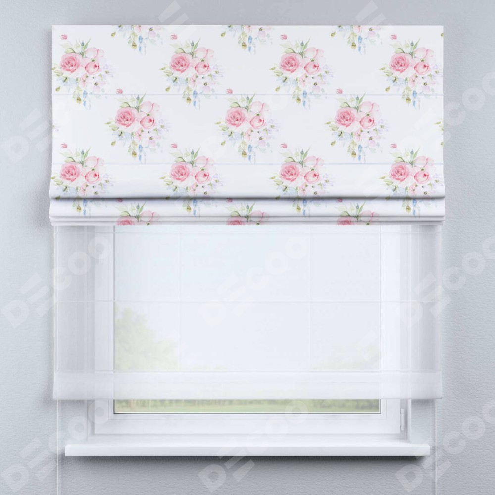 Римская штора день-ночь производителя «Cortin», используется для проёма, пошита из двух полотен, с лицевой блэкаут с нанесением сублимационной печати «Нежный розарий», вторая ткань тюль (по стандарту комплектуется тюль белого цвета артикул V-01). Имеет универсальный механизм и подходит для монтажа: на потолок, на стену и в нишу.