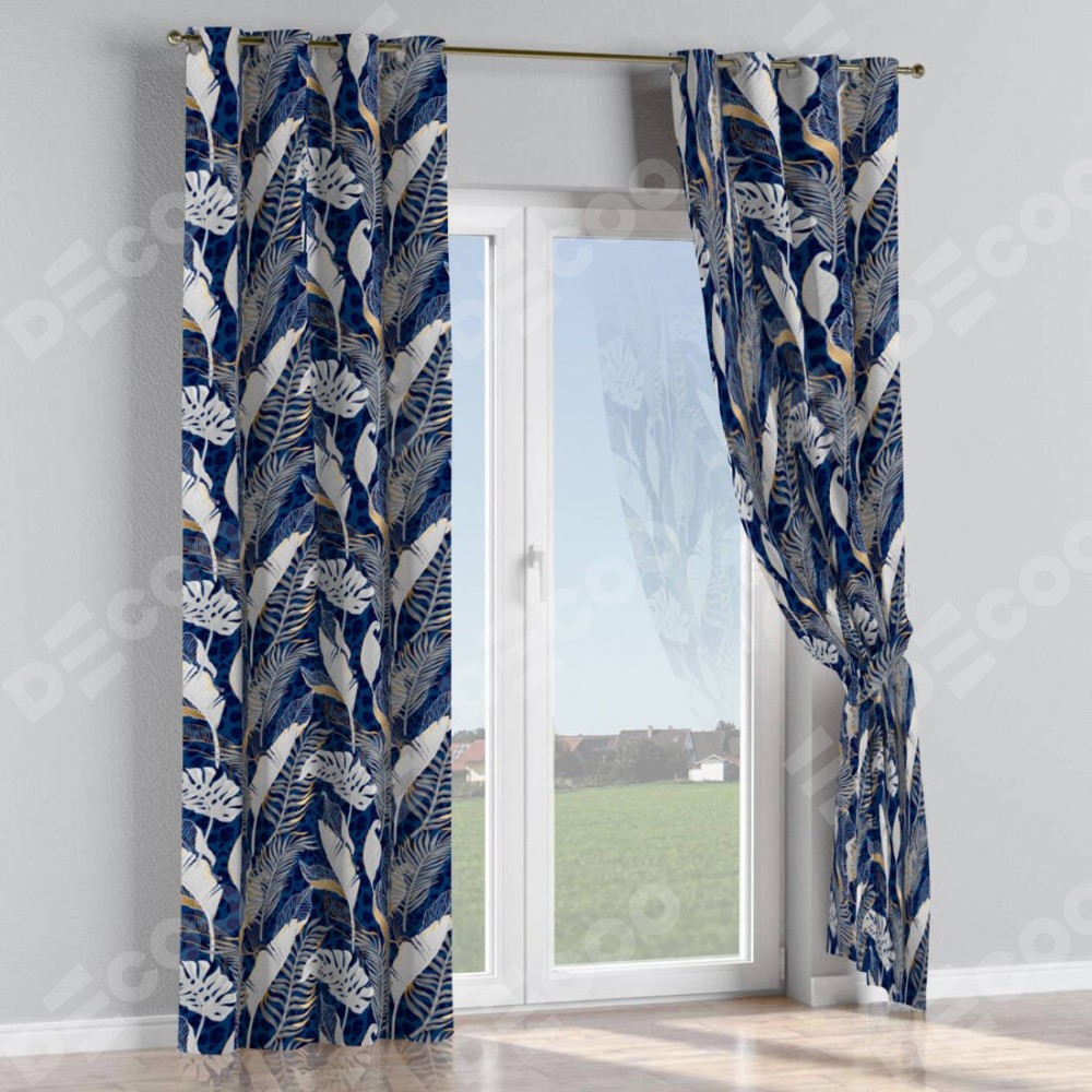 Комплект прямых штор, от производителя «Cortin», пошиты из ткани блэкаут с нанесением сублимационной печати «Сине-золотые джунгли». Данная модель пошита на люверсах, комплектуется на выбор круглым карнизом и подходит для монтажа на стену или потолок. Прямые шторы на люверсах шьются по стандарту с коэффициентом 1/2 (на 100 см. ширины проёма 200 см. ширины ткани), отличительным преимуществом данной модели является простой способ монтажа. Достаточно повесить ее на трубу и штора готова!