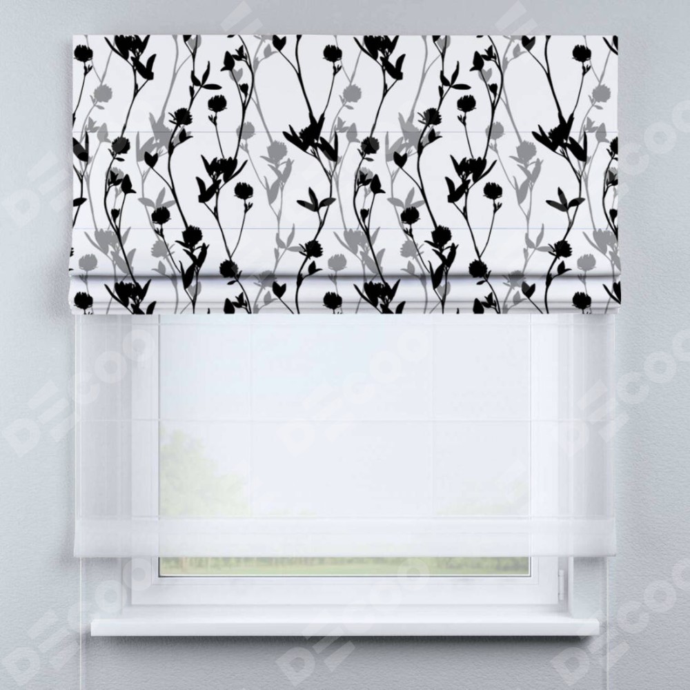 Римская штора день-ночь производителя «Cortin», используется для проёма, пошита из двух полотен, с лицевой блэкаут с нанесением сублимационной печати «Цветочный силуэт», вторая ткань тюль (по стандарту комплектуется тюль белого цвета артикул V-01). Имеет универсальный механизм и подходит для монтажа: на потолок, на стену и в нишу.