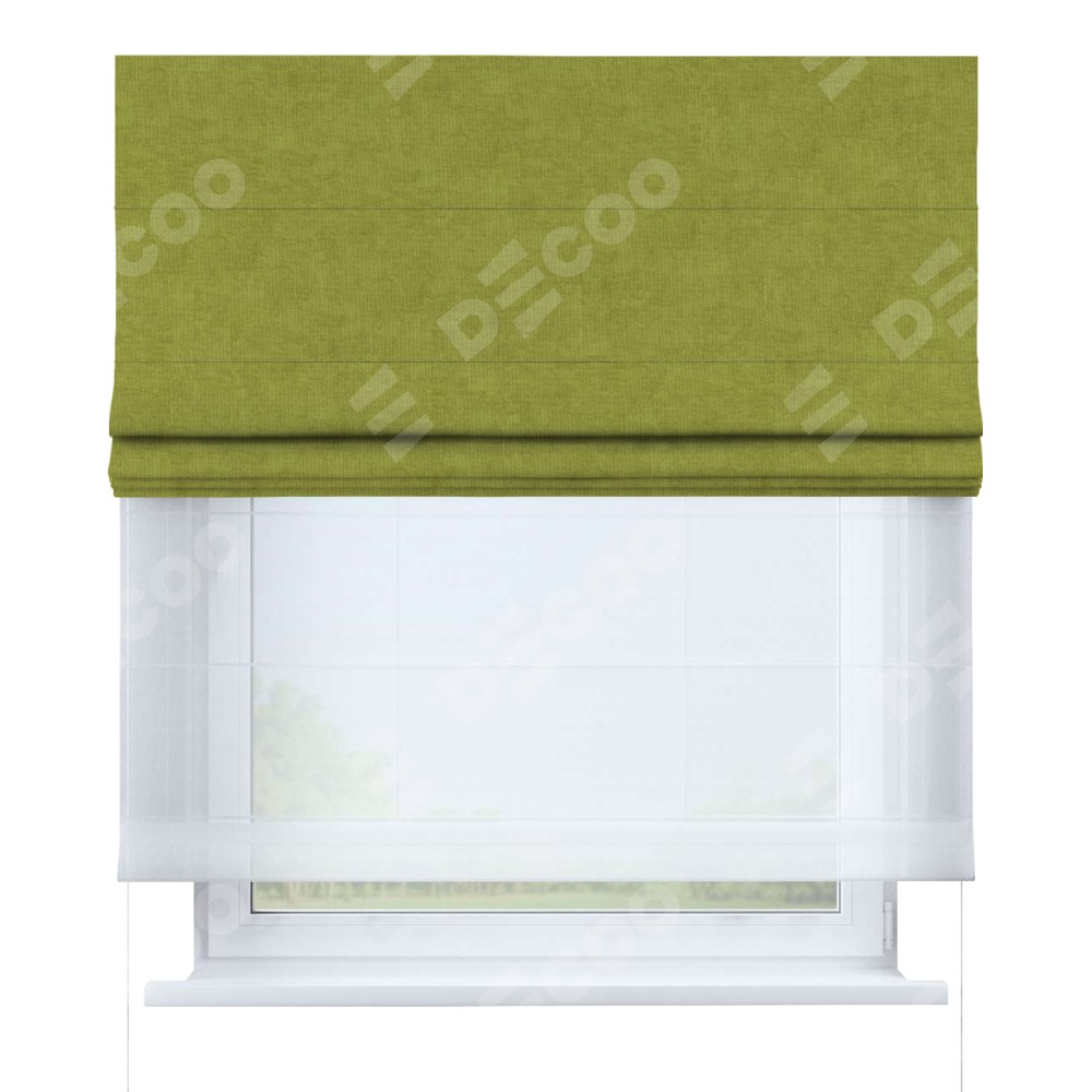 Римская штора день-ночь производителя «Cortin», используется для проёма, пошита из двух полотен, с лицевой стороны канвас зелёное яблоко артикул v-370, вторая ткань тюль (по стандарту комплектуется тюль белого цвета артикул V-01). Имеет универсальный механизм и подходит для монтажа: на потолок, на стену и в нишу.