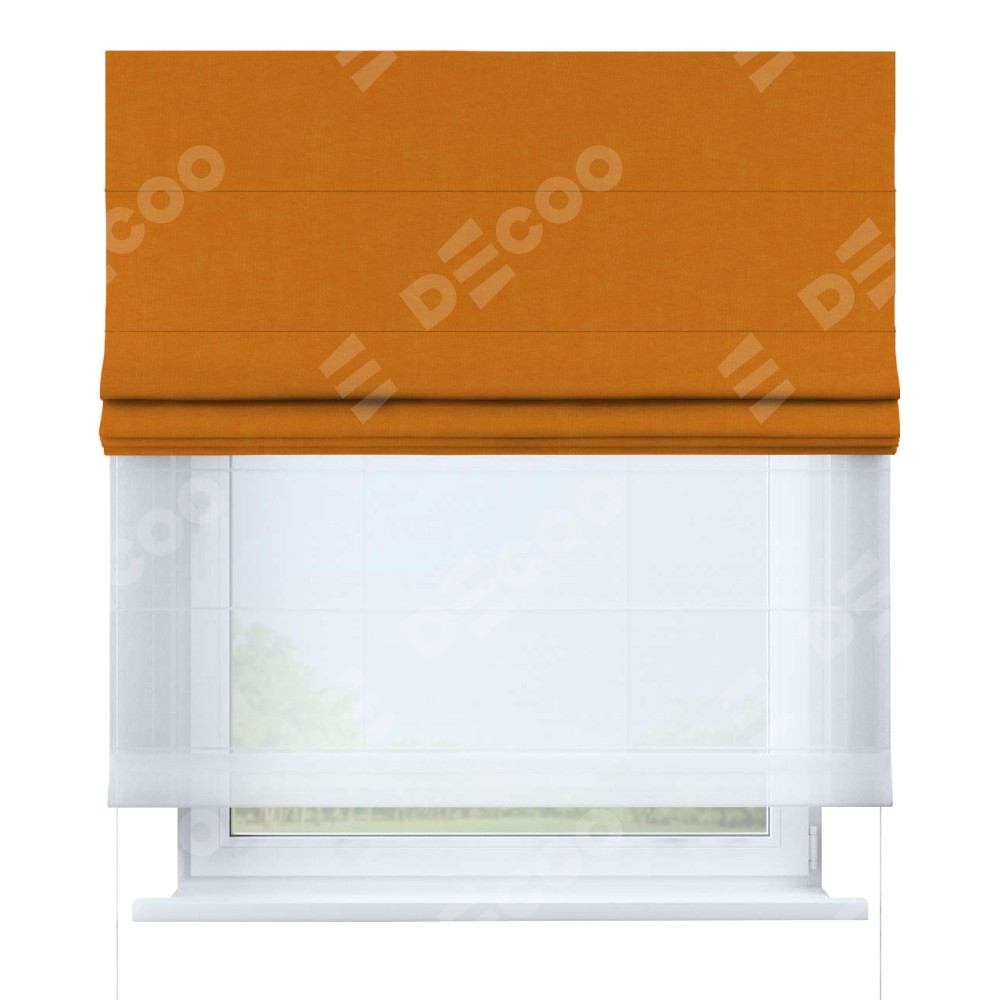 Римская штора день-ночь производителя «Cortin», используется для проёма, пошита из двух полотен, с лицевой стороны канвас оранжевый артикул v-106, вторая ткань тюль (по стандарту комплектуется тюль белого цвета артикул V-01). Имеет универсальный механизм и подходит для монтажа: на потолок, на стену и в нишу.