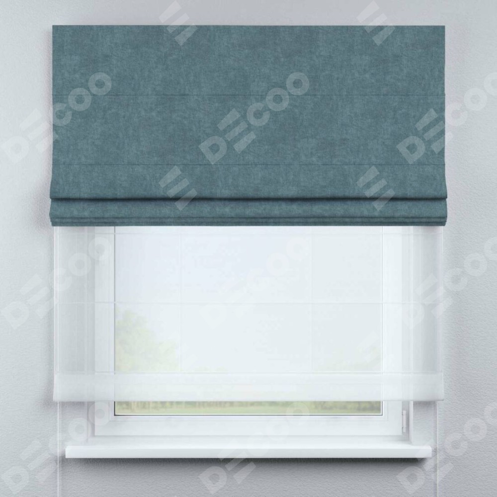 Римская штора день-ночь производителя «Cortin», используется для проёма, пошита из двух полотен, с лицевой стороны канвас серо-голубой артикул v-330, вторая ткань тюль (по стандарту комплектуется тюль белого цвета артикул V-01). Имеет универсальный механизм и подходит для монтажа: на потолок, на стену и в нишу.
