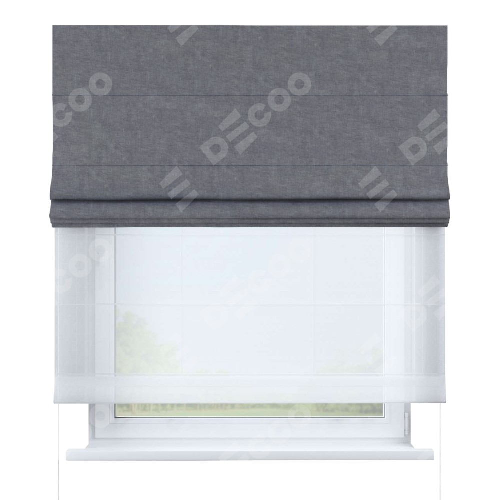 Римская штора день-ночь производителя «Cortin», используется для проёма, пошита из двух полотен, с лицевой стороны канвас стальной артикул v-1082, вторая ткань тюль (по стандарту комплектуется тюль белого цвета артикул V-01). Имеет универсальный механизм и подходит для монтажа: на потолок, на стену и в нишу.