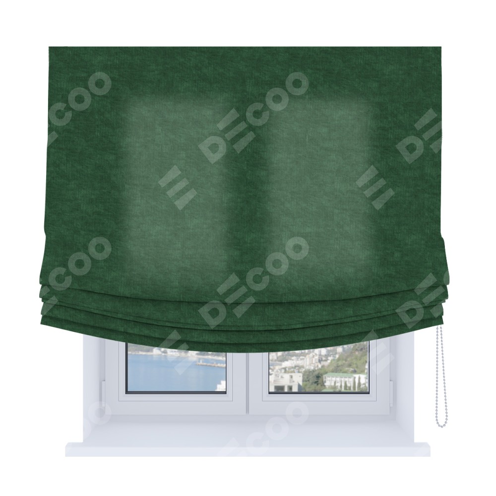 Римская штора Soft производителя «Cortin», используется для проёма, пошита из ткани канвас тёмно-зелёный, артикул ткани v-469. Имеет универсальный механизм и подходит для монтажа: на потолок, на стену и в нишу. В отличие от стандартных римских штор, римская штора Soft не имеет горизонтальных вставок и нижнего отвеса. Это позволяет ткани произвольно драпироваться в свободные мягкие складки.