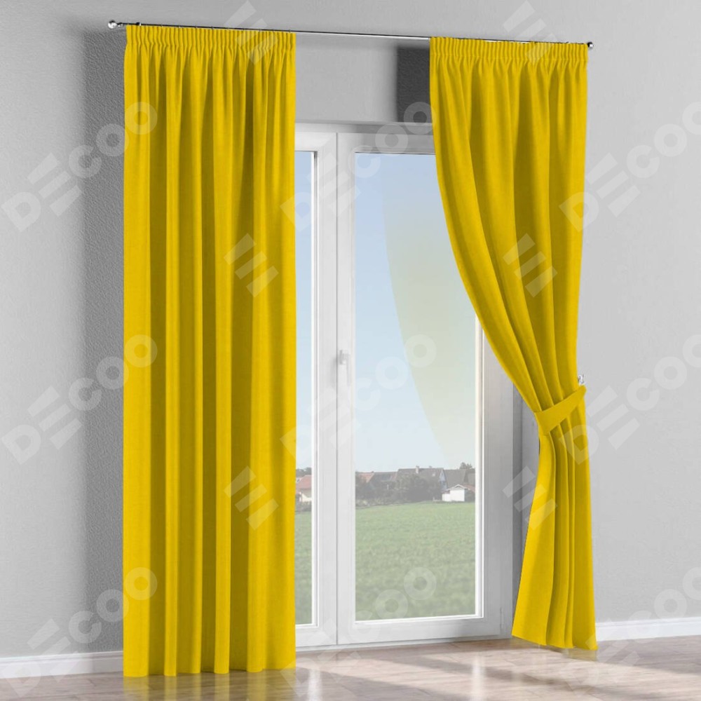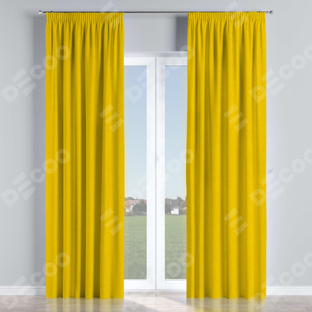 Комплект прямых штор, от производителя «Cortin», пошиты из ткани канвас желтый, артикул ткани v-344. С изнаночной стороны в верхней части штор пристрачивается шторная лента с декоративными складками «Карандаш». Для создания элегантных складок прямые шторы шьются по стандарту с коэффициентом 1:2 (на 100 см. ширины проёма 200 см. ширины ткани).