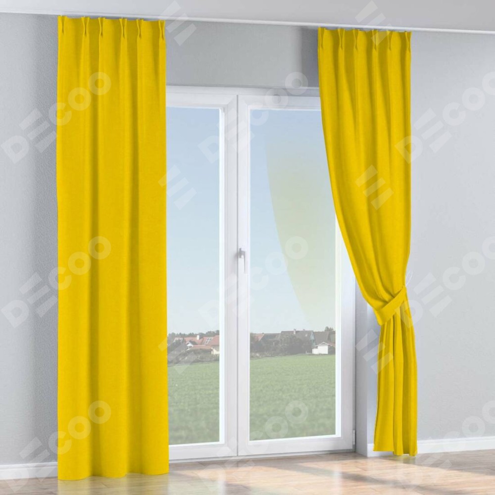 Комплект прямых штор, от производителя «Cortin», пошиты из ткани канвас желтый, артикул ткани v-344. С изнаночной стороны в верхней части штор пристрачивается шторная лента с декоративными складками «Кустик». Для создания элегантных складок прямые шторы шьются по стандарту с коэффициентом 1:2 (на 100 см. ширины проёма 200 см. ширины ткани).