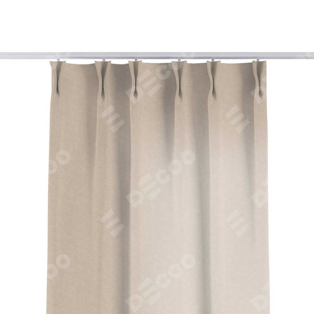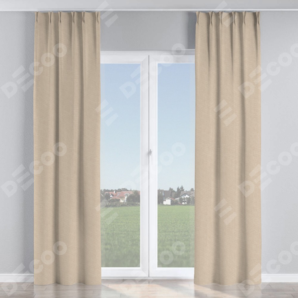 Комплект прямых штор, от производителя «Cortin», пошиты из ткани канвас кофе с молоком, артикул ткани v-07. С изнаночной стороны в верхней части штор пристрачивается шторная лента с декоративными складками «Кустик». Для создания элегантных складок прямые шторы шьются по стандарту с коэффициентом 1:2 (на 100 см. ширины проёма 200 см. ширины ткани).