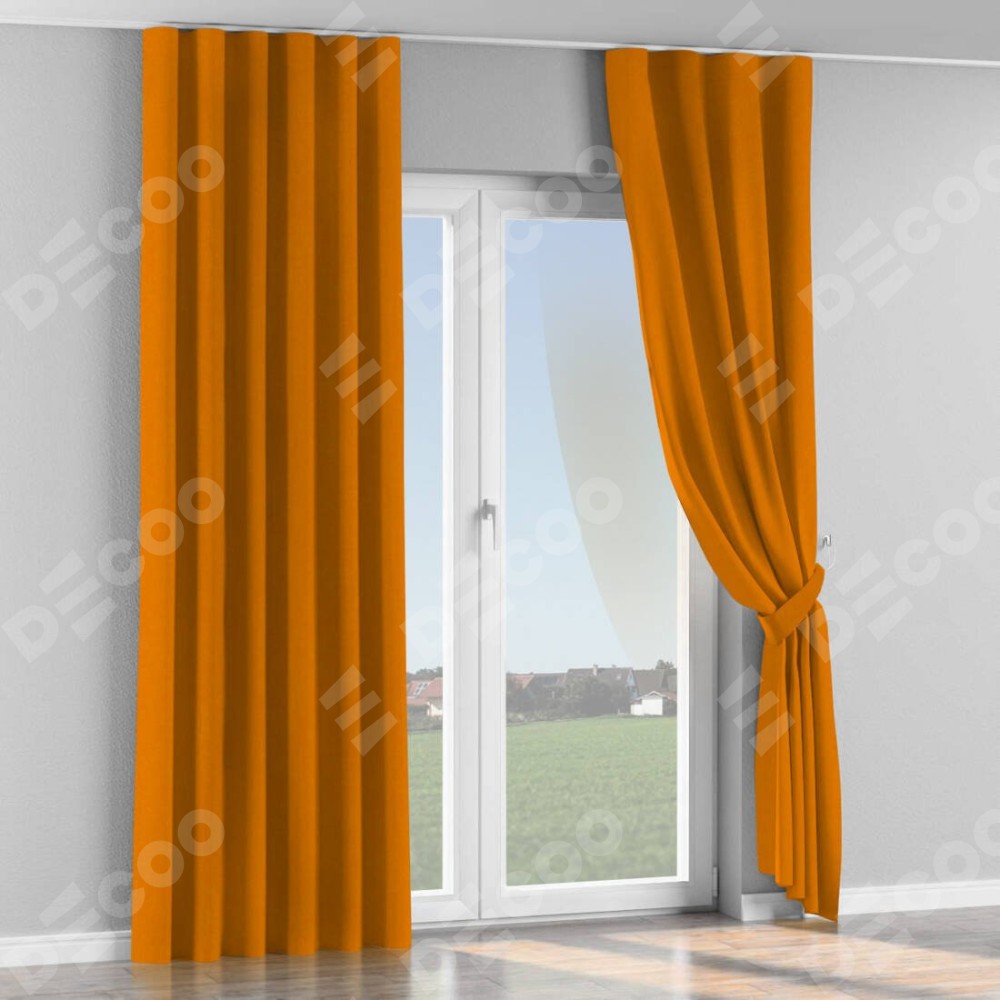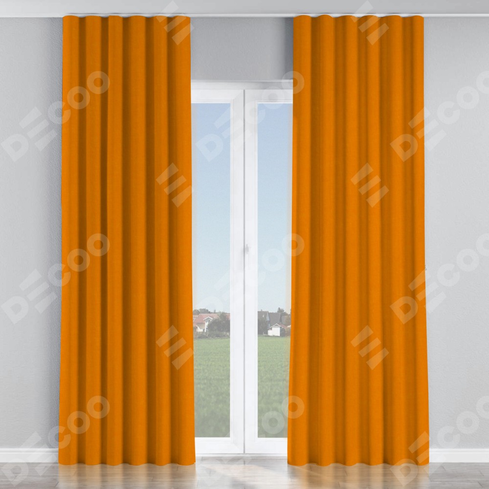 Комплект прямых штор, от производителя «Cortin», пошиты из ткани канвас оранжевый, артикул ткани v-106. С изнаночной стороны в верхней части штор пристрачивается шторная лента с декоративными складками «Волна». Для создания элегантных складок прямые шторы шьются по стандарту с коэффициентом 1:2 (на 100 см. ширины проёма 200 см. ширины ткани).