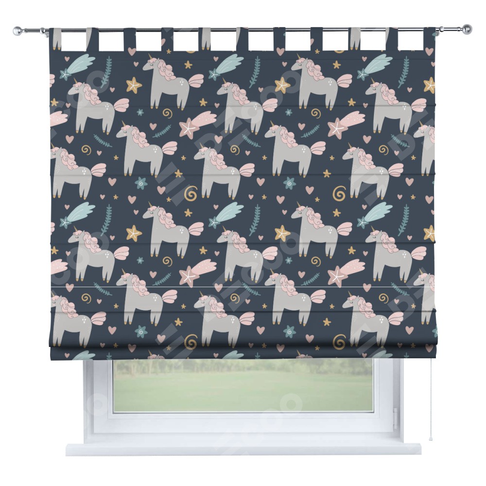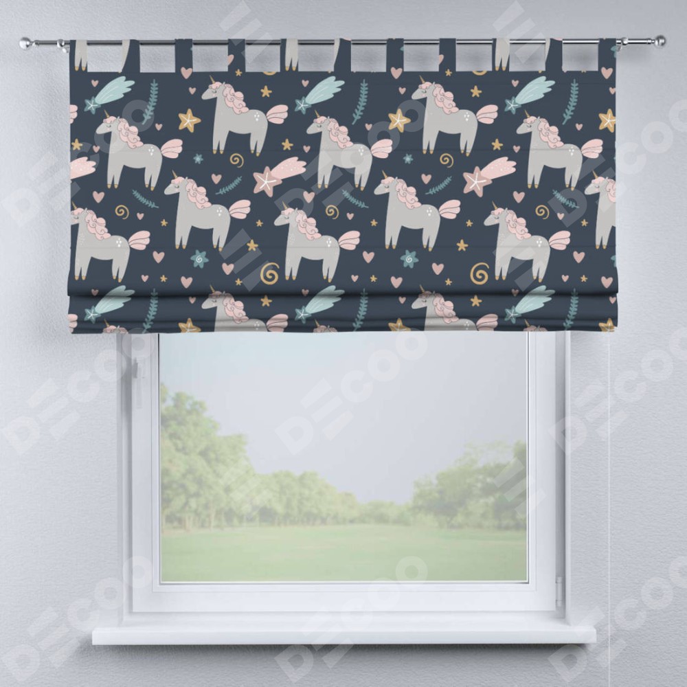 Римская штора производителя «Cortin», используется для проёма, пошита из ткани блэкаут с нанесением сублимационной печати «Милые единороги». Данная модель пошита на петлях, комплектуется на выбор круглым карнизом и подходит для монтажа на стену. Римская штора на петлях имеет простую систему регулировки высоты, отличительным преимуществом данной модели является простой способ монтажа. Достаточно повесить ее на трубу и штора готова!