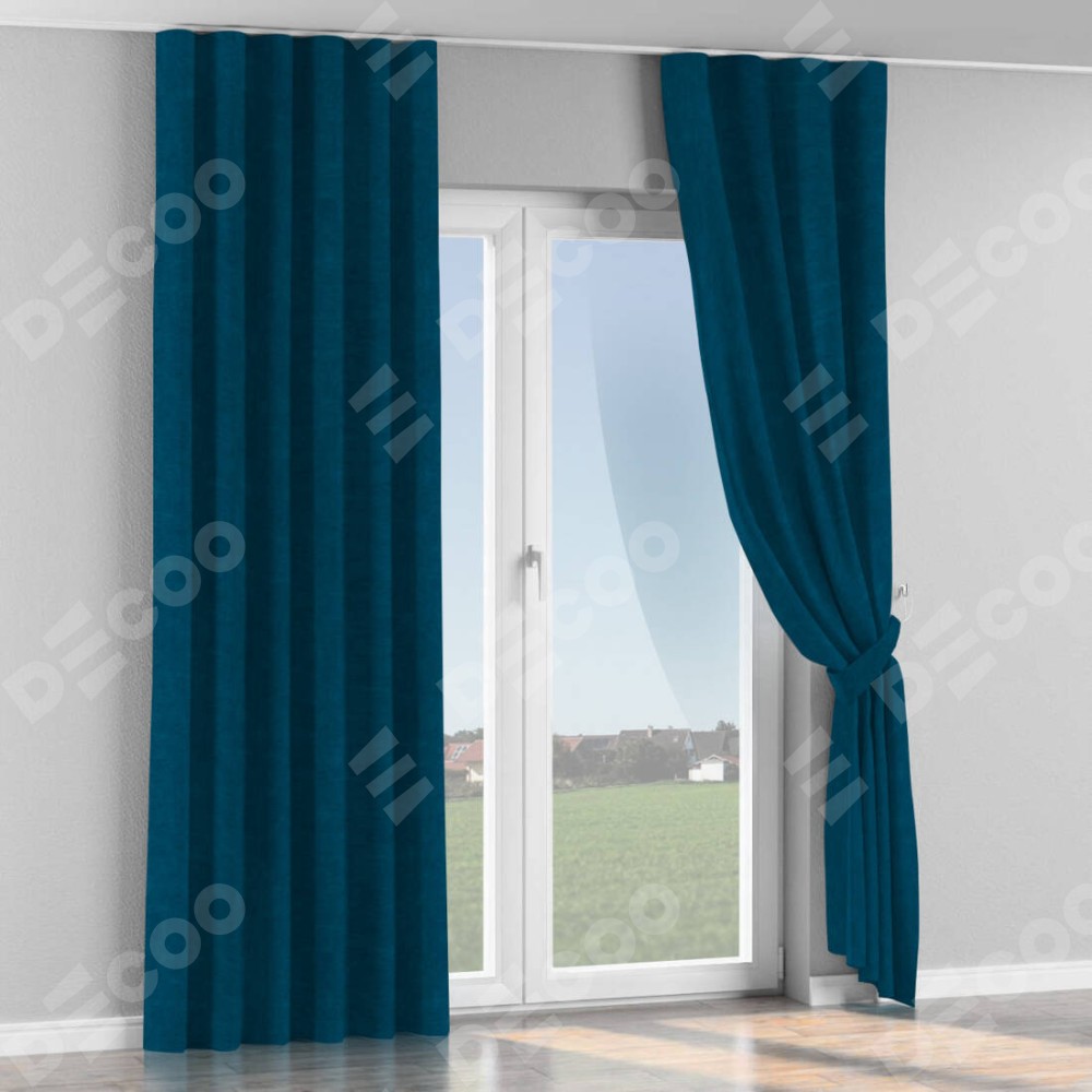 Комплект прямых штор, от производителя «Cortin», пошиты из ткани канвас синий, артикул ткани v-573. С изнаночной стороны в верхней части штор пристрачивается шторная лента с декоративными складками «Волна». Для создания элегантных складок прямые шторы шьются по стандарту с коэффициентом 1:2 (на 100 см. ширины проёма 200 см. ширины ткани).