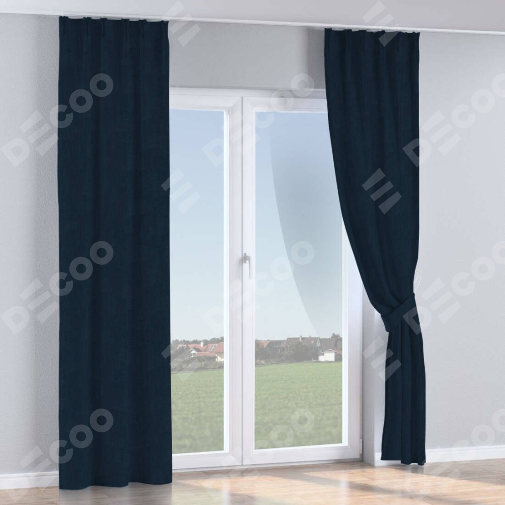 Комплект прямых штор, от производителя «Cortin», пошиты из ткани канвас тёмно-синий, артикул ткани v-206. С изнаночной стороны в верхней части штор пристрачивается шторная лента с декоративными складками «Кустик». Для создания элегантных складок прямые шторы шьются по стандарту с коэффициентом 1:2 (на 100 см. ширины проёма 200 см. ширины ткани).