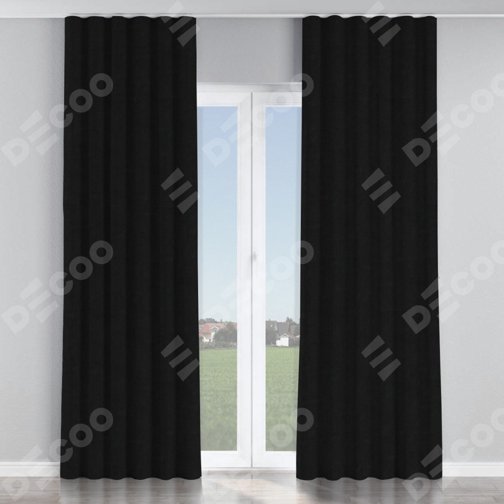 Комплект прямых штор, от производителя «Cortin», пошиты из ткани канвас черный, артикул ткани v-194. С изнаночной стороны в верхней части штор пристрачивается шторная лента с декоративными складками «Волна». Для создания элегантных складок прямые шторы шьются по стандарту с коэффициентом 1:2 (на 100 см. ширины проёма 200 см. ширины ткани).