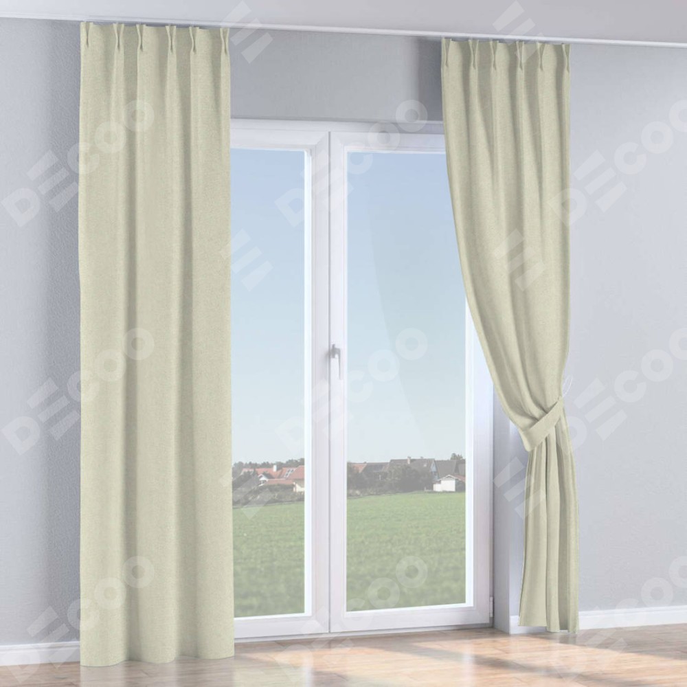 Комплект прямых штор, от производителя «Cortin», пошиты из ткани твид блэкаут шампань, артикул ткани 90929. С изнаночной стороны в верхней части штор пристрачивается шторная лента с декоративными складками «Кустик». Для создания элегантных складок прямые шторы шьются по стандарту с коэффициентом 1:2 (на 100 см. ширины проёма 200 см. ширины ткани).
