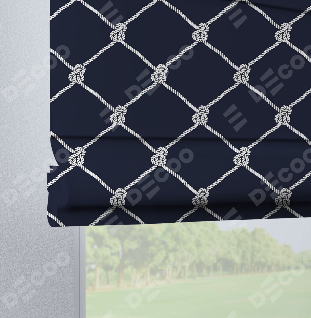 Римская штора производителя «Cortin», используется для проёма, пошита из ткани блэкаут с нанесением сублимационной печати «Морские веревки». Данная модель пошита на петлях, комплектуется на выбор круглым карнизом и подходит для монтажа на стену. Римская штора на петлях имеет простую систему регулировки высоты, отличительным преимуществом данной модели является простой способ монтажа. Достаточно повесить ее на трубу и штора готова!