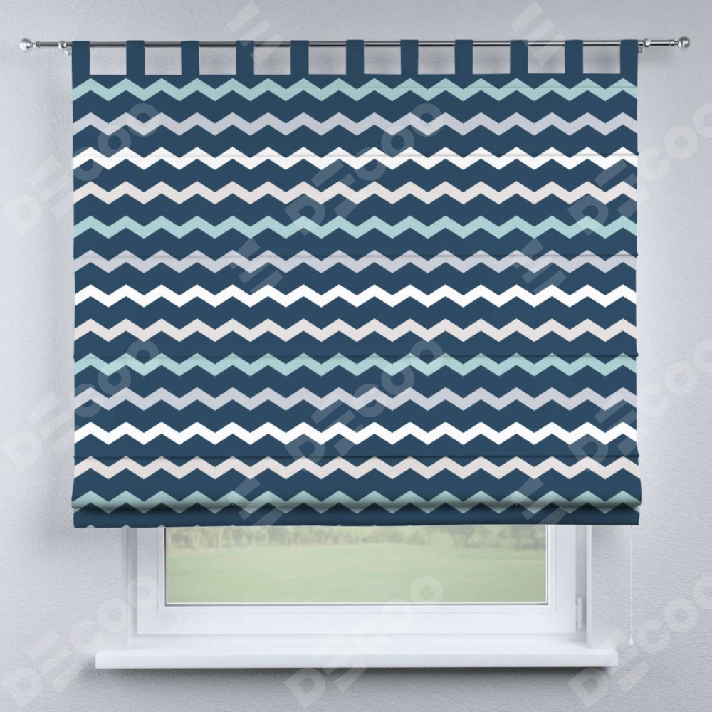Римская штора производителя «Cortin», используется для проёма, пошита из ткани блэкаут с нанесением сублимационной печати «Морской шеврон». Данная модель пошита на петлях, комплектуется на выбор круглым карнизом и подходит для монтажа на стену. Римская штора на петлях имеет простую систему регулировки высоты, отличительным преимуществом данной модели является простой способ монтажа. Достаточно повесить ее на трубу и штора готова!